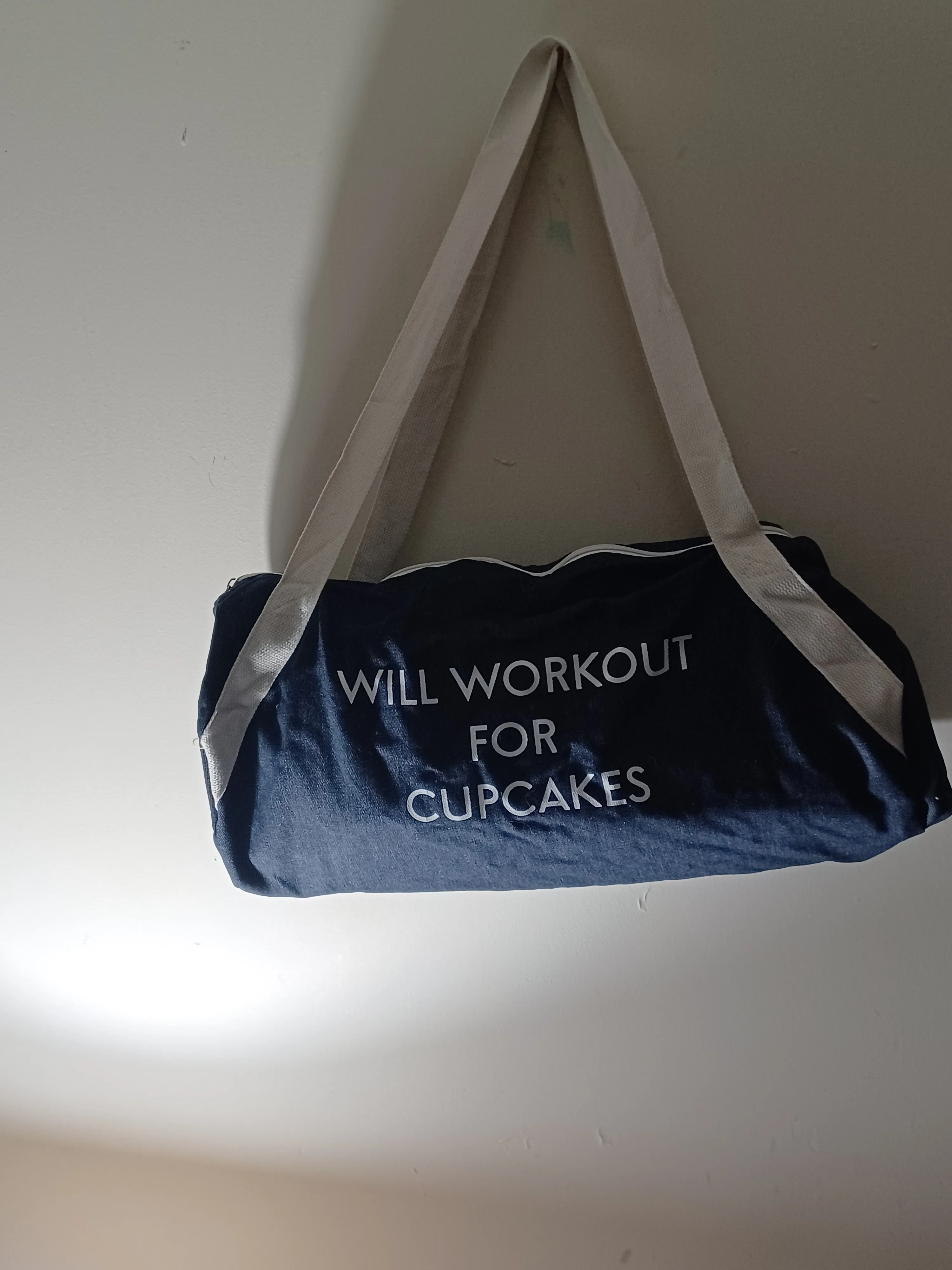 Pretty average bag has the cute quote "will workout for cupcakes"