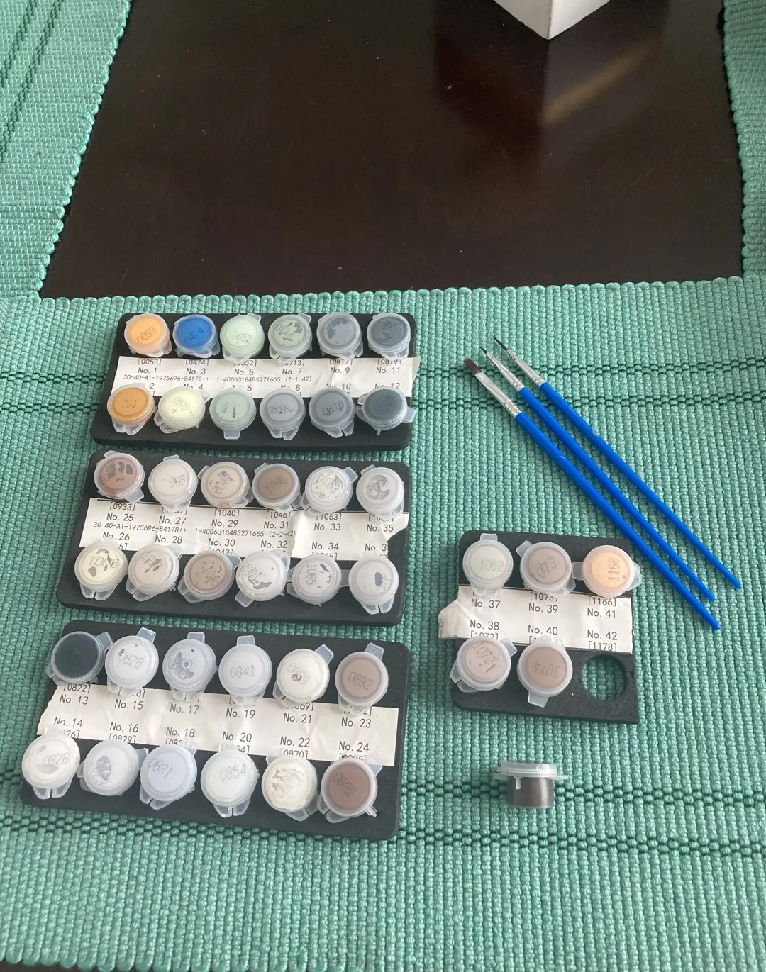 Acrylic paints left over from a paint by numbers. Most of the mini pots have over half of the paint remaining
