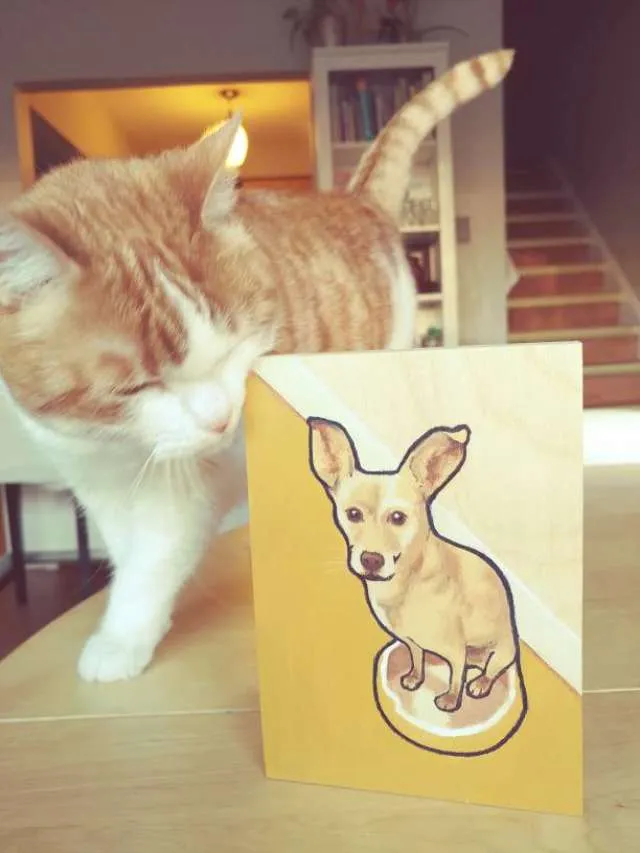 5x7 Portrait of dog in cat bed. Mixed media on plyboard. 1.5" thick. Painted by yours truly. Posted for collateral for trades. ISO things I have ❤. Full list in a separate post.