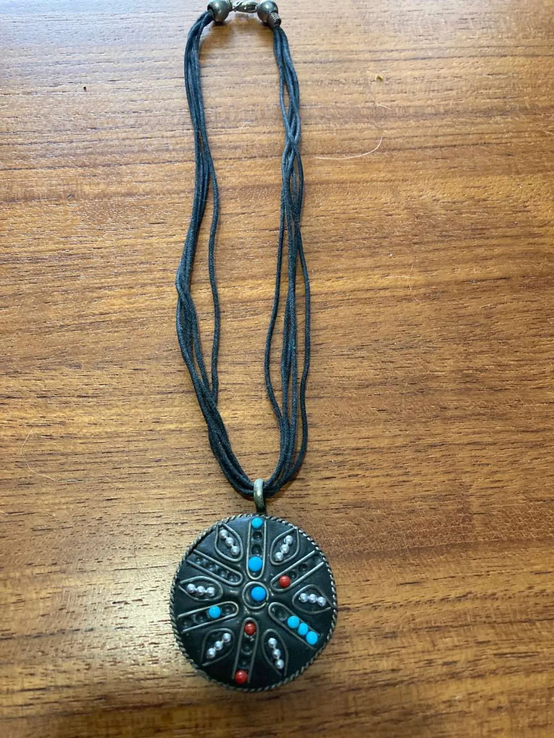 Missing a few beads but still cute. Strung on multiple leather cords.15" long