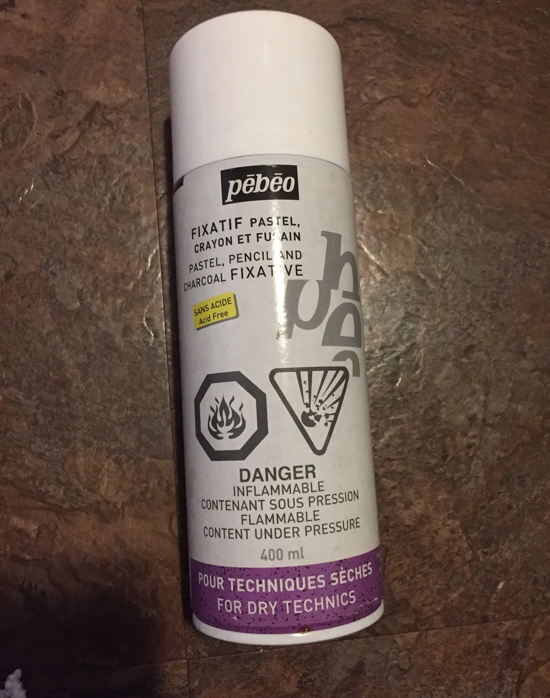 Spray this on art that you want to protect from yellowing, pastel drawings. Don’t want much. Come get it and bring me some fruit, coffee or a joint