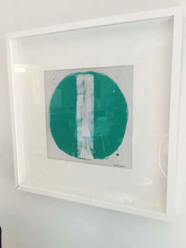 Solid wood and glass frame - has a tiny knick at the bottom (barely noticeable). Dimensions 21"x21"