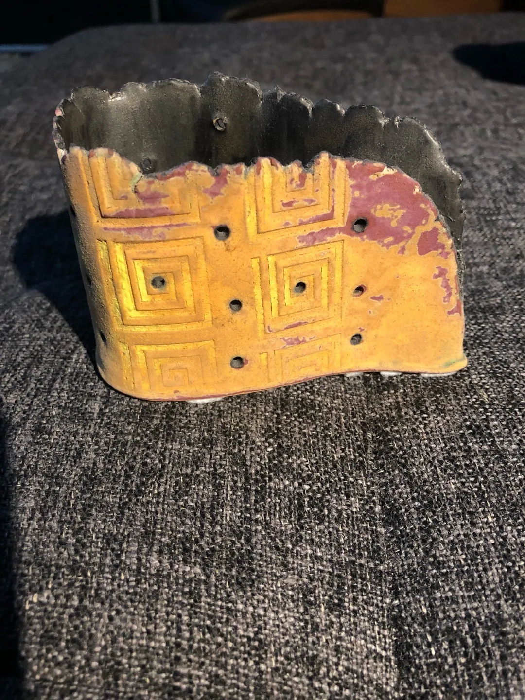 Made by local artist. Bought this ceramic cutie at the biannual Hamilton Potters Guild Art Show. The colours on this thing are gorgeous but its really hard to appreciate in the pic. Took the photos in the daytime, so hard to tell, but the candle light illuminates out of the square holes (was attempting to show this in the very last image of the 3rd photo). You can have the little battery operated “candle” that’s currently in it.