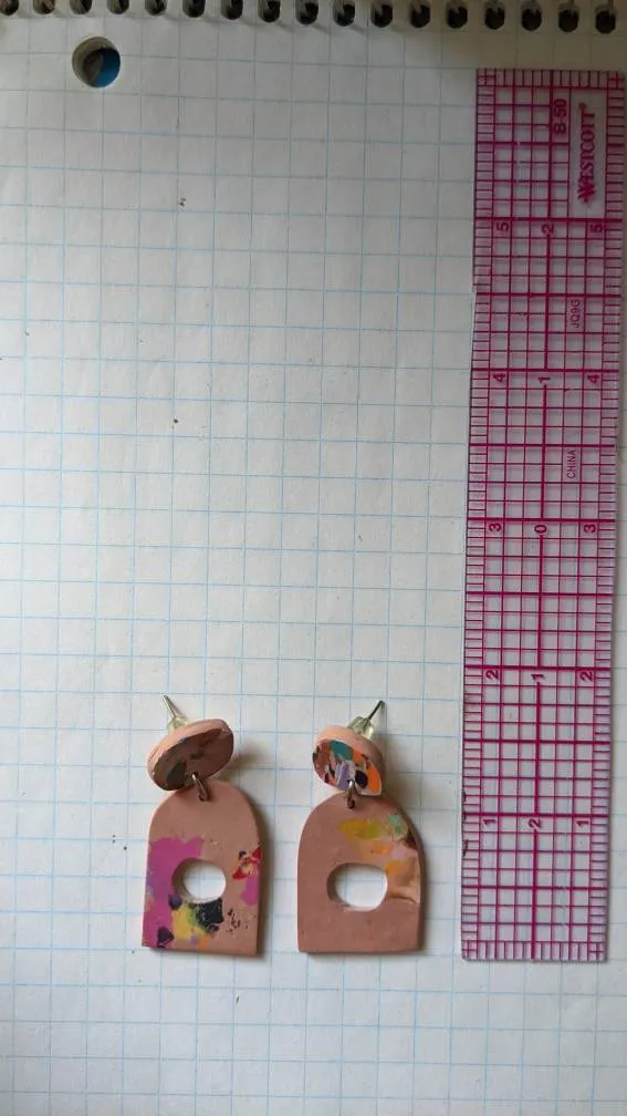 Handmade earrings with a stud backing. Muted pink with multicolour accents. Will be sanitized before trading, of course.