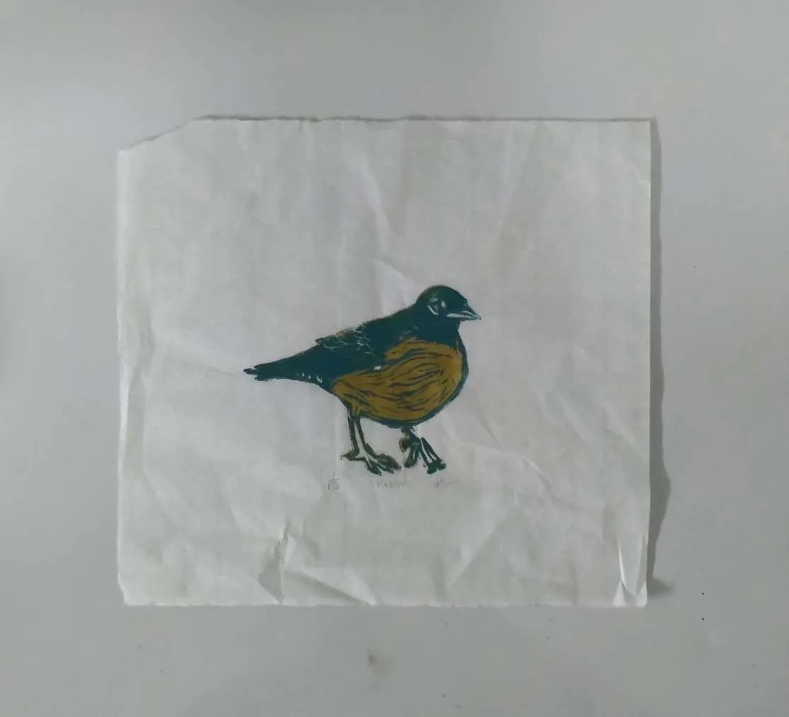 Lovely linocut printing of a bird made by Yukon artist Kimberly Edgar in 2015. 1/13 prints. It measures about 21cm x 23cm. Wrinkles due to poor storage and transportation :(