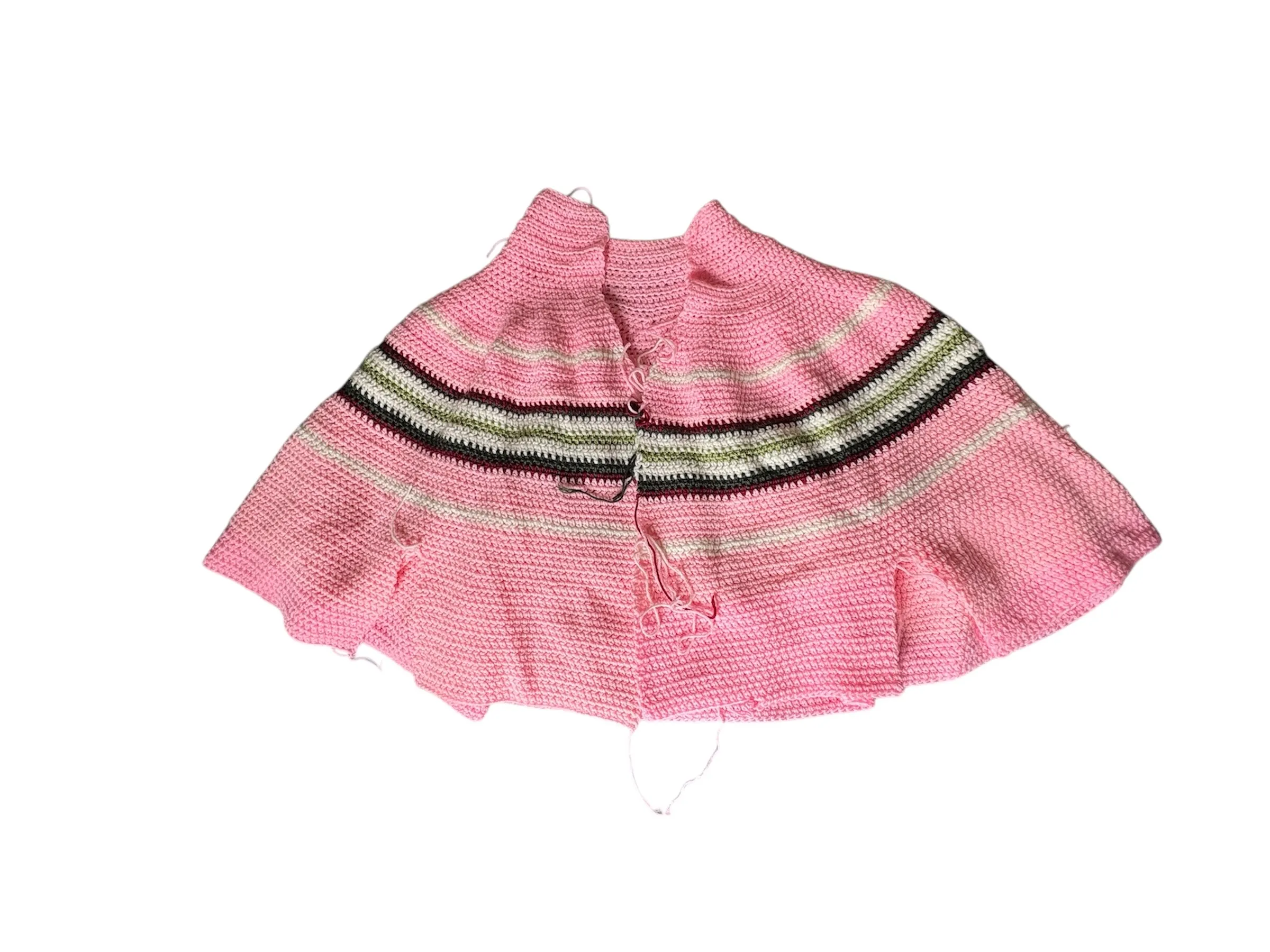Chic pink knit cape with stylish stripes. Perfect for layering. It’s unfinished so you’ll have to weave in the ends. It’s pretty wide. Measurements available upon request.