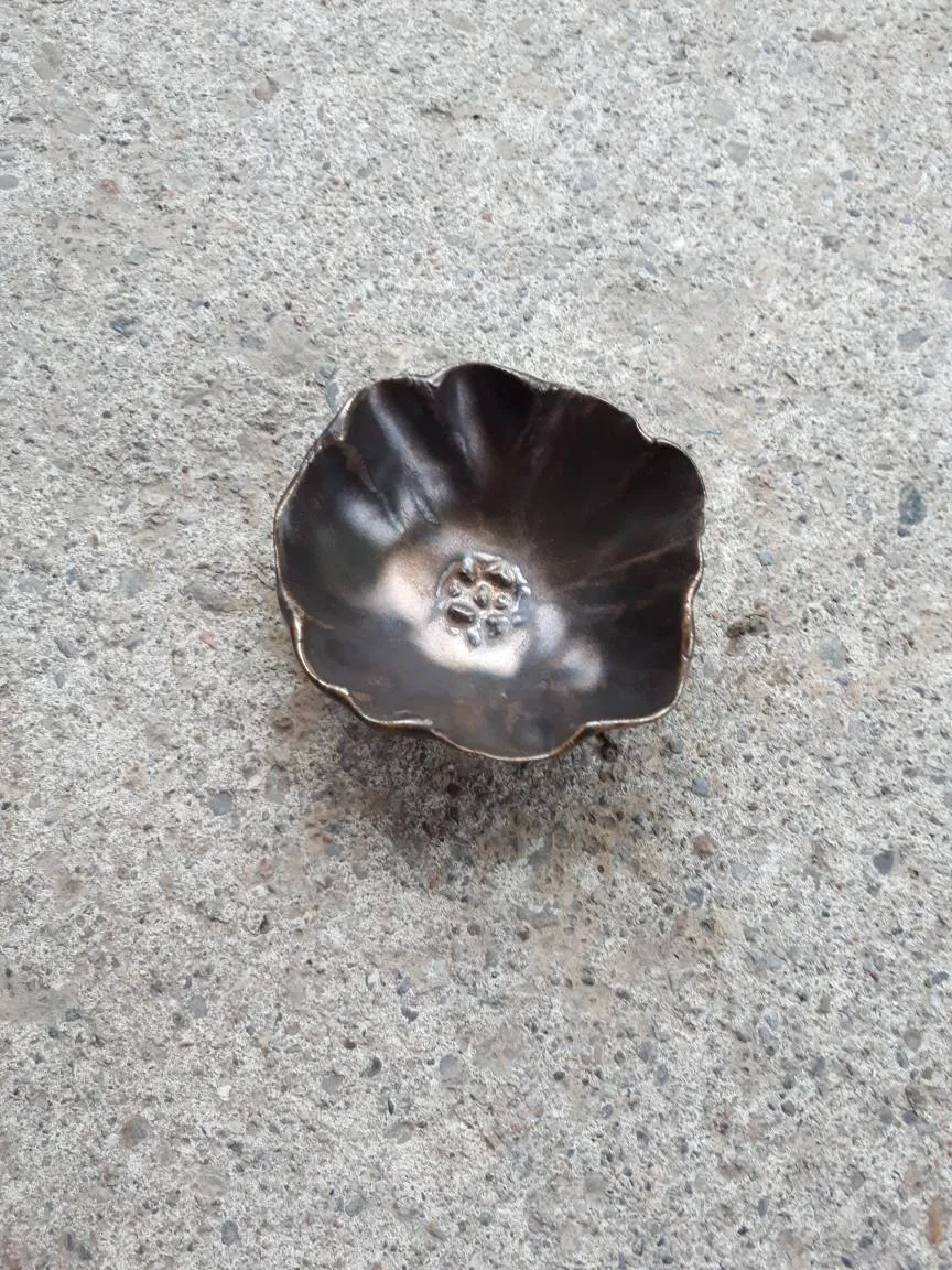 Good for jewellery or other small items like keys. Beautiful shifting bronze metallic glaze. Made by clay shapes. 3" wide x 1" tall $8 value