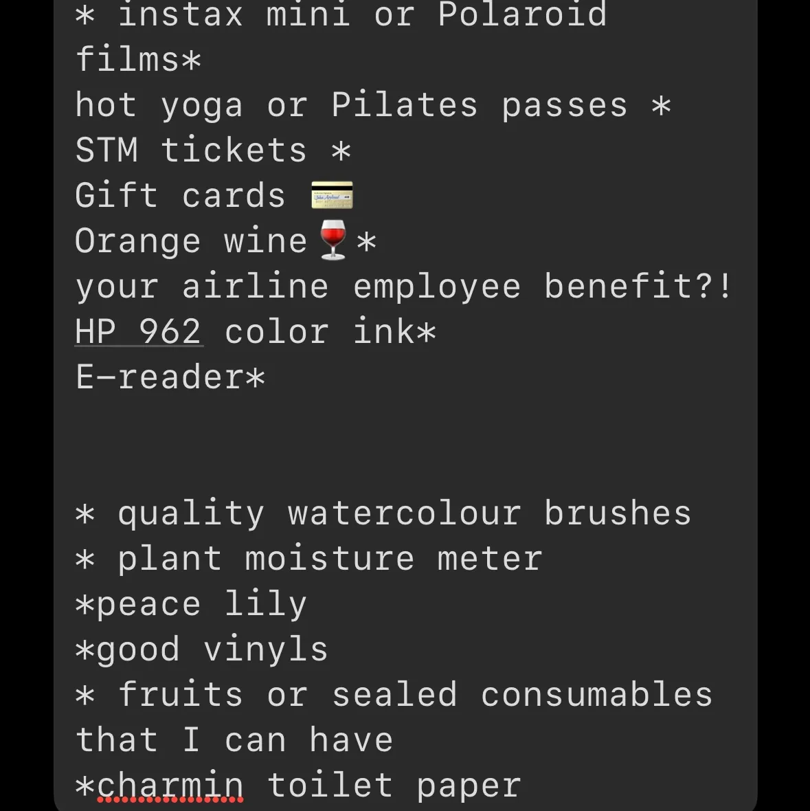 instax mini or Polaroid films* hot yoga or Pilates passes * STM tickets * Gift cards 💳 Orange wine🍷*