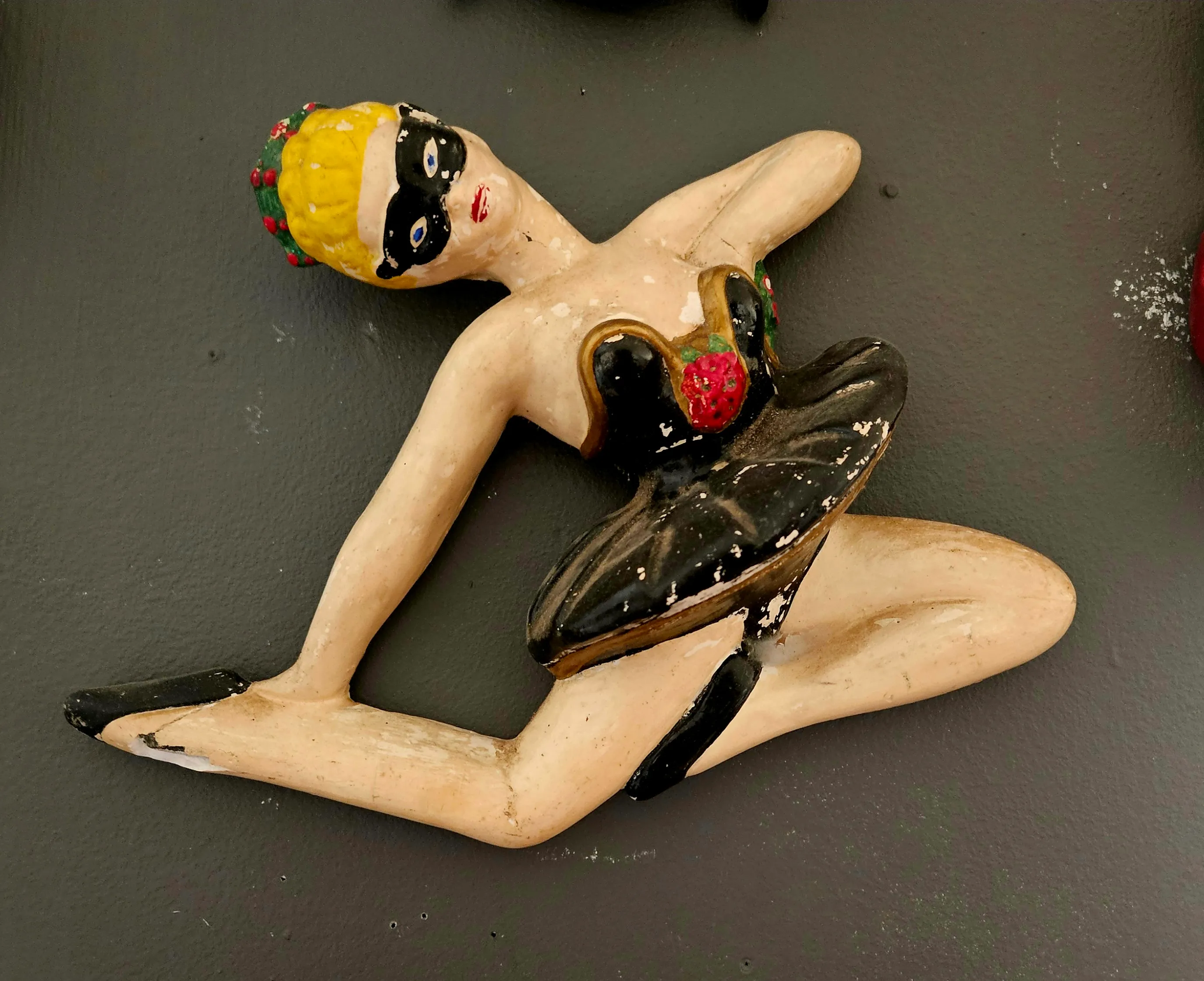Unique vintage ballerina figurine. Hand-painted, shows some wear. Black tutu, blonde hair, and a mask. Great for collectors or vintage decor.