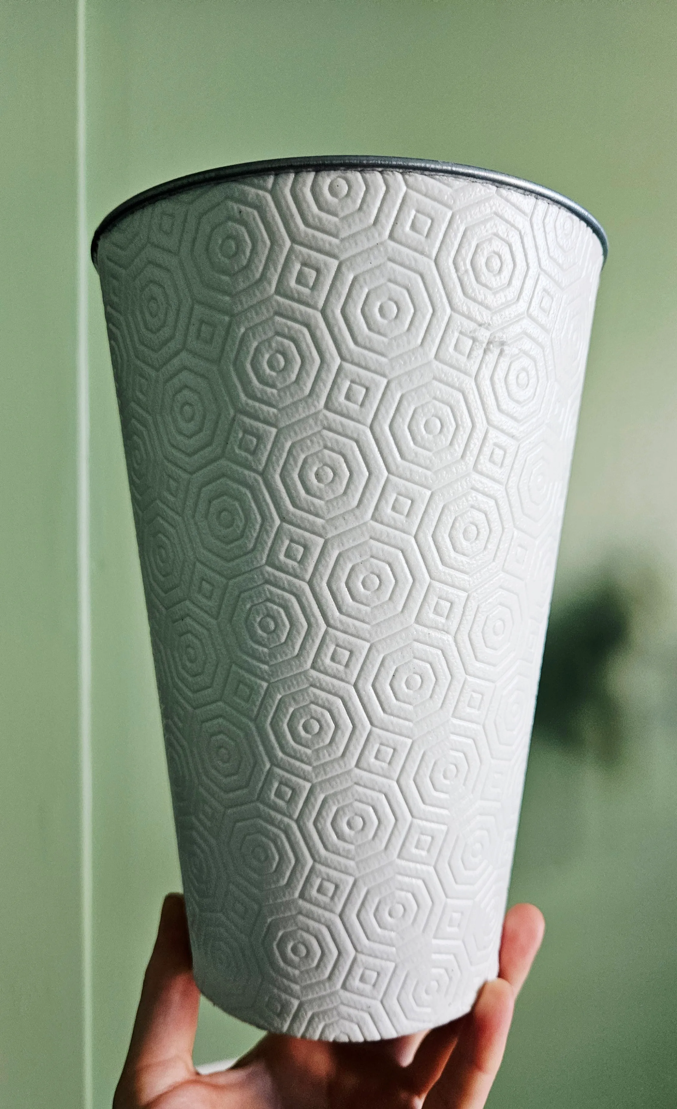 white metal bucket with an embossed geometric pattern. It has a silver rim. There are some signs of use on the bottom and inside, as shown in the pictures