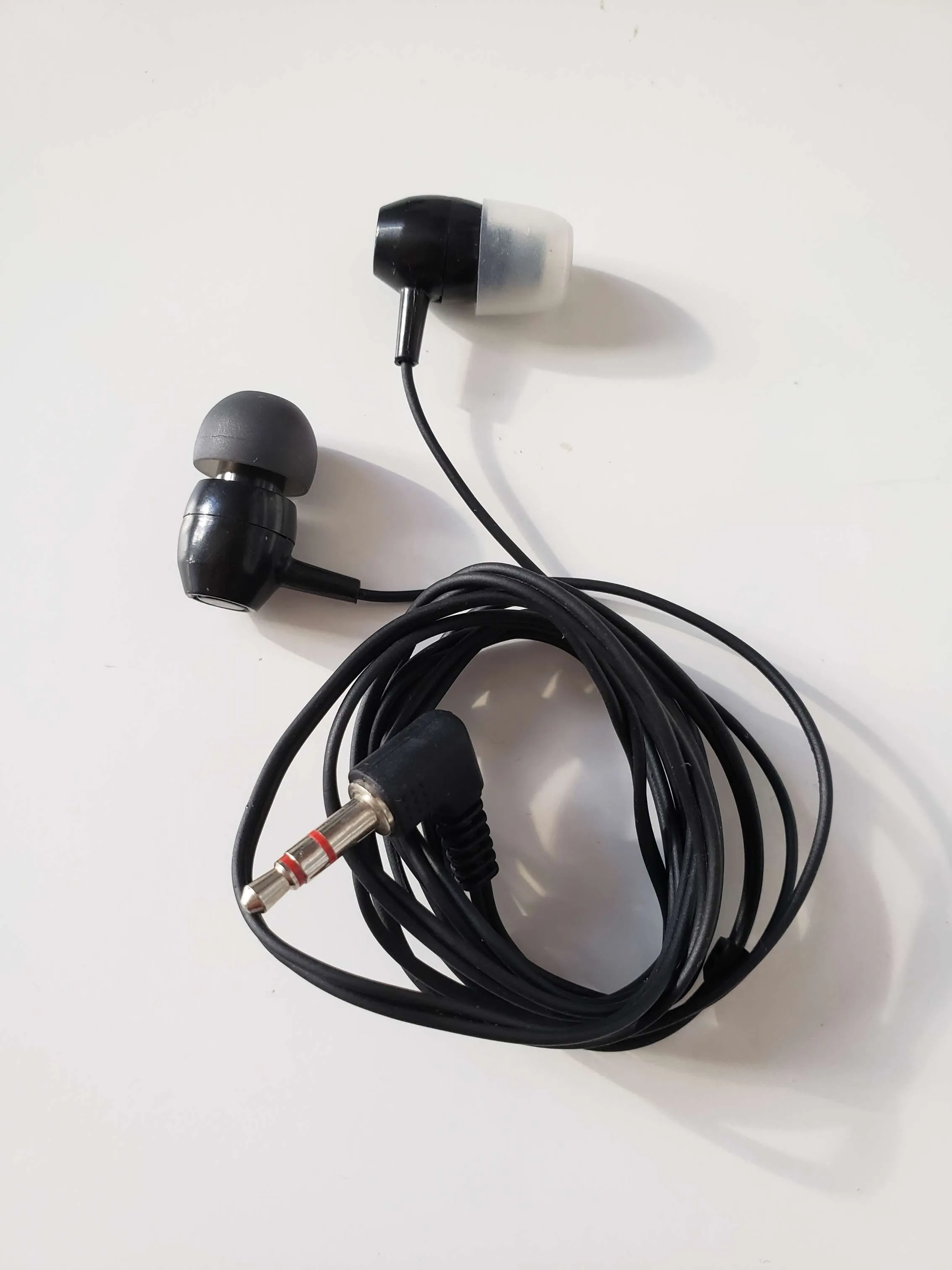 headphones -- simple wired audio mismatched white and black cushioned ear phones (I switched to wireless earbuds so letting these buds go -- these ones work fine, I just lost one of the ear thingies so replaced it with a different colour)