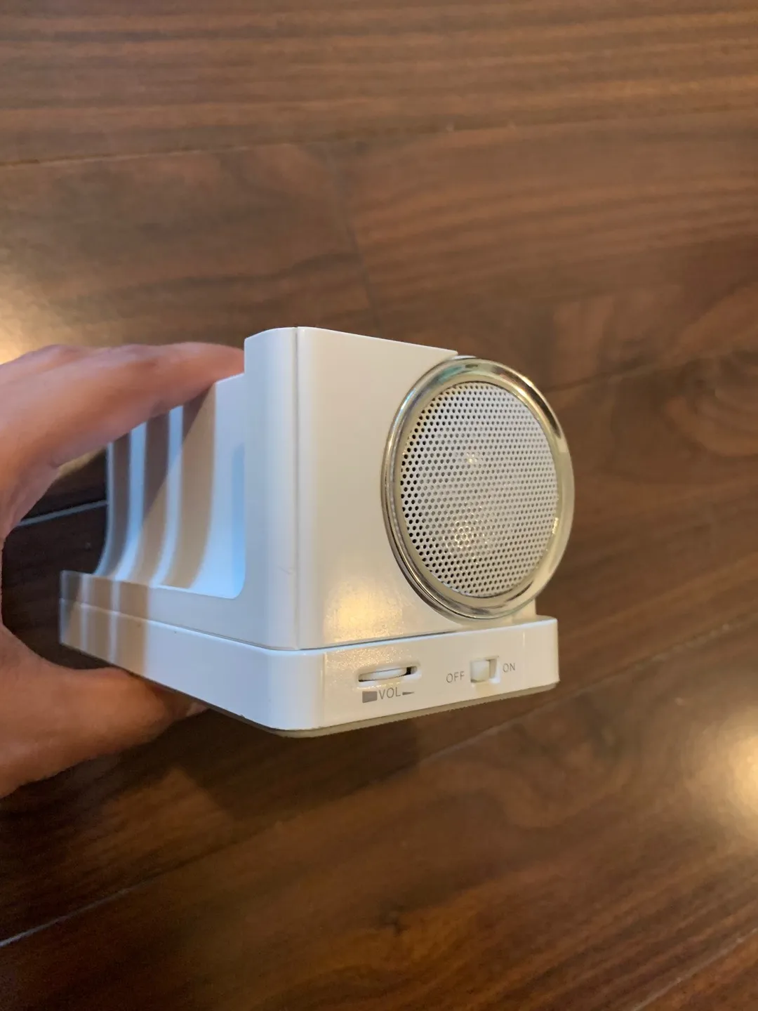 Speaker for old ipods. Works well but I tend to listen to audio through headphones. Has AUX cord input (cable not included) and charger input (cable included but not pictured)