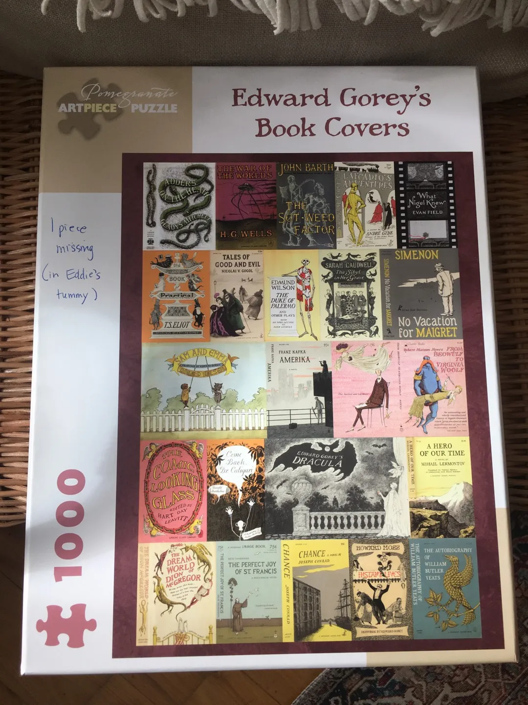 1000 piece puzzle. One piece is missing (see picture). Some of the edge pieces (around 4) are old and damaged.