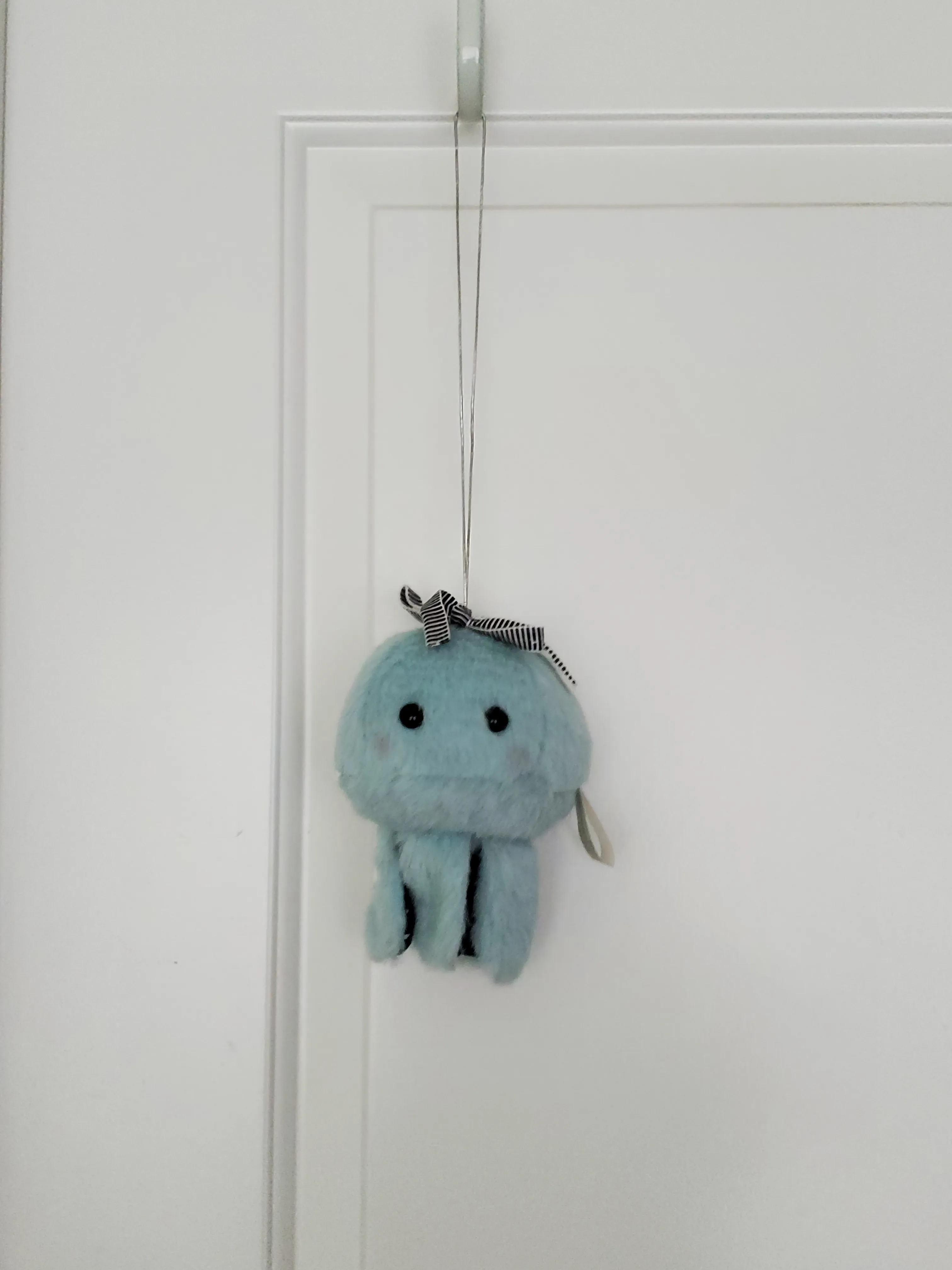 Has a hanging string and removable striped bow on it head. You can just snip the string off I guess, if you're worried about a choking hazard.