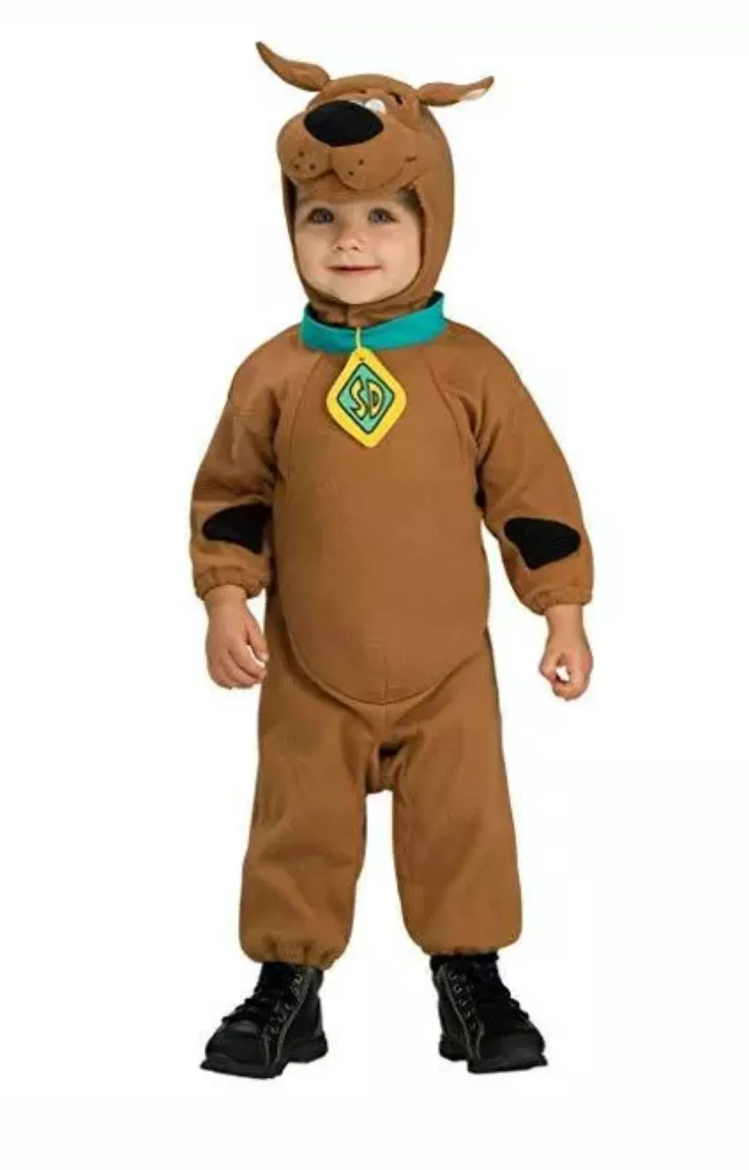 Officially licensed Scooby-Doo infant ( 6-12 months) costume Child Deluxe Scooby-Doo costume includes velour jumpsuit with attached plush headpiece collar and springy tail polyester One piece Zipper in the front Dog paws slip over hands Tail on the back of the jumpsuit Blue collar with ''SD'' printed on the tag Attached stuffed Scooby headpiece #halloween