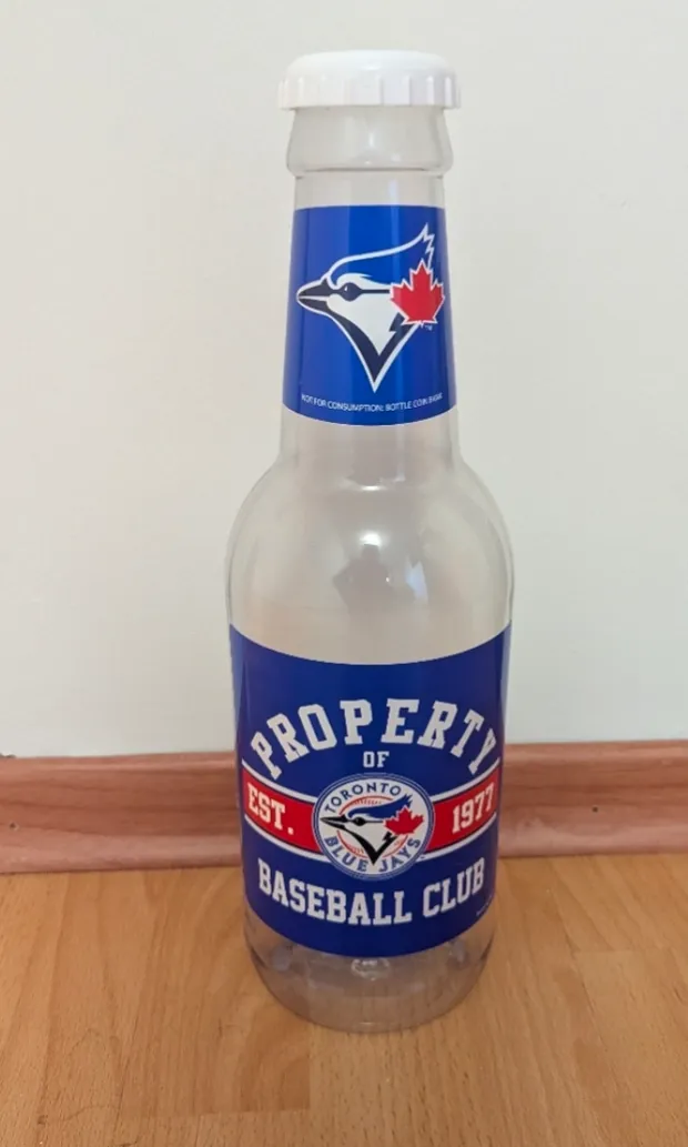 Trading a Toronto Blue Jays coin bank shaped like a bottle. It says "Property of Toronto Blue Jays Baseball Club Est. 1977" on the front. Great for any Blue Jays fan!