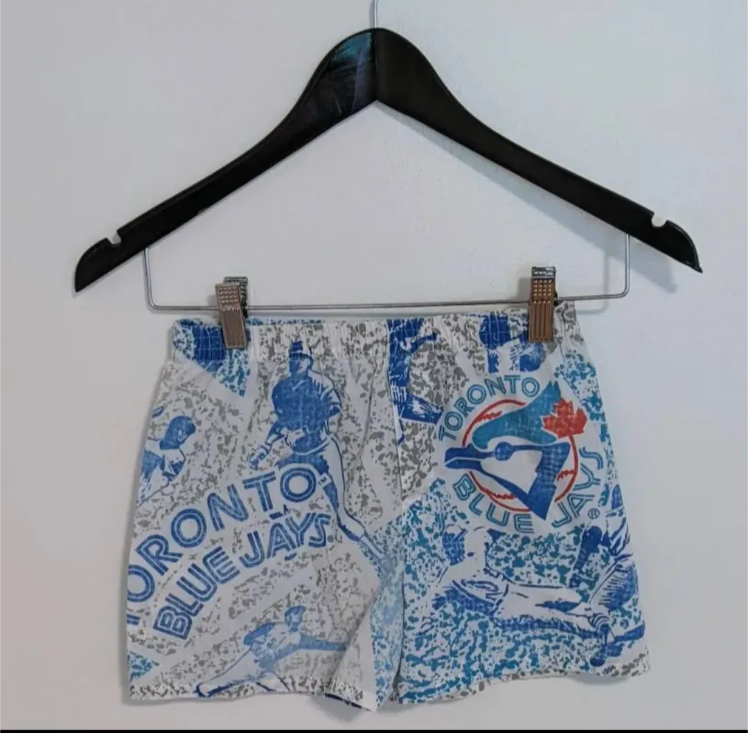 Here are some Toronto Blue Jays shorts for kids! They feature a fun, all-over print with baseball players and the Blue Jays logo. Perfect for any young fan!
