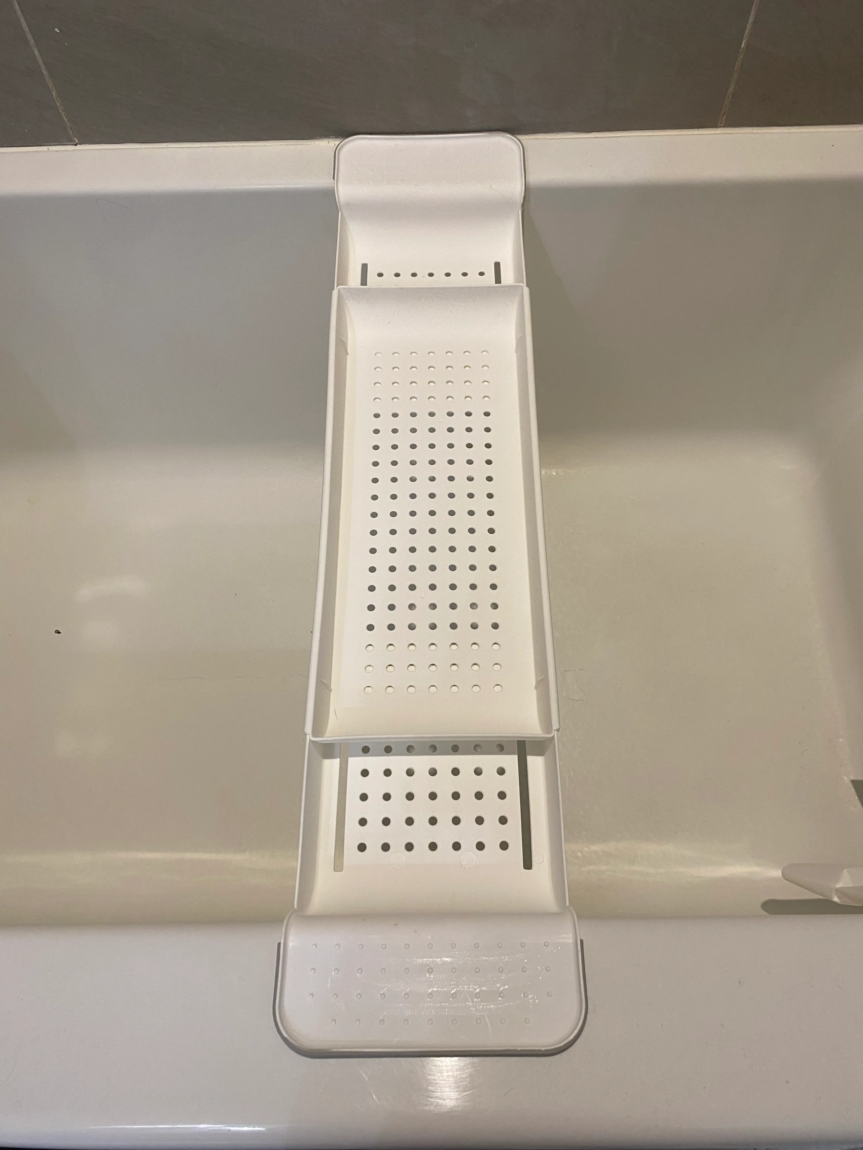 Expandable organizer fits most sinks and tubs. Durable plastic construction. Features multiple compartments. Perfect for toiletries or dishes.
