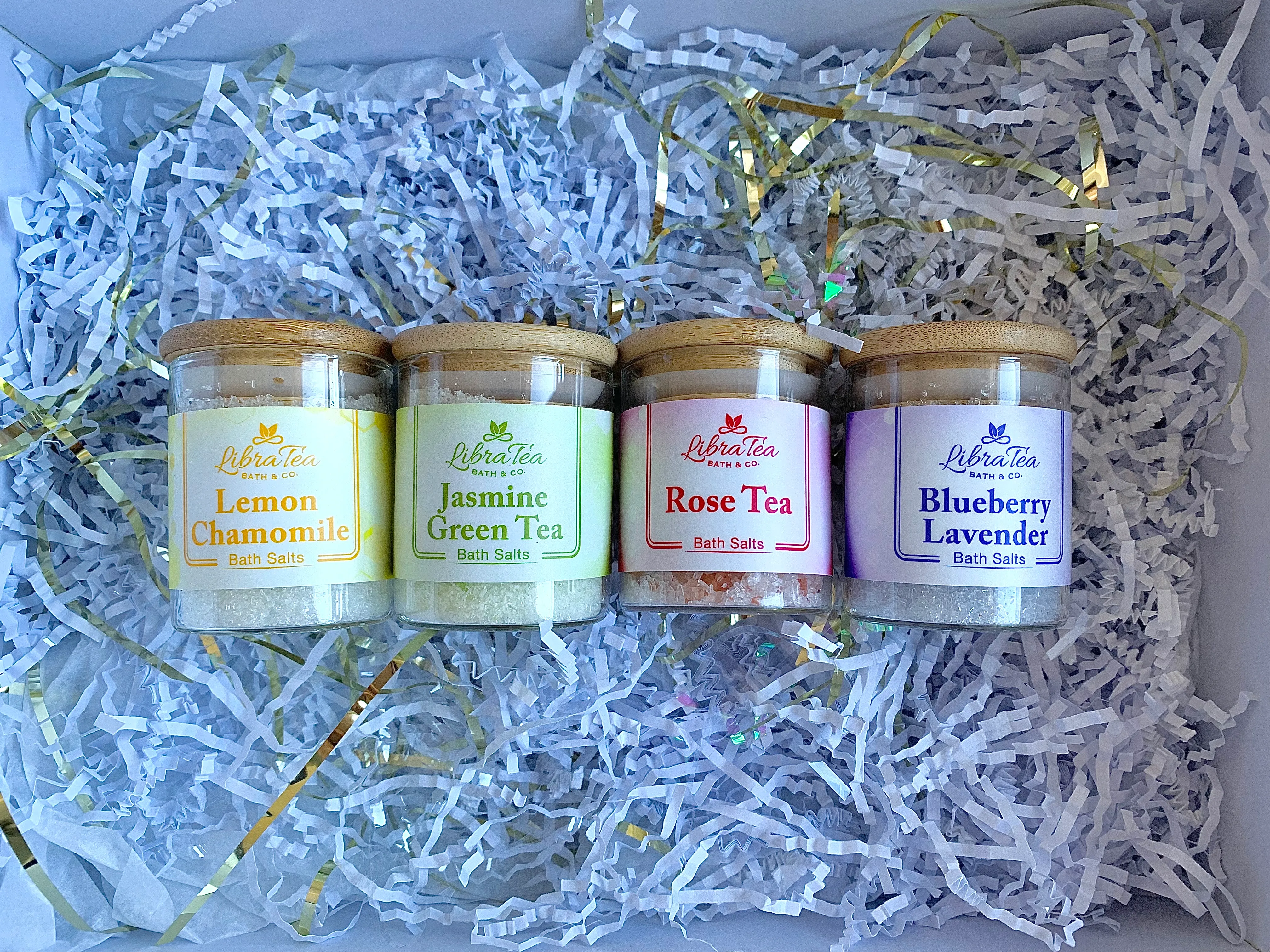 Give yourself or your loved ones bath salts for the holidays. Comes in 4 scents - blueberry lavender, rose tea, jasmine green tea, and lemon chamomile. Can trade in the following sets: