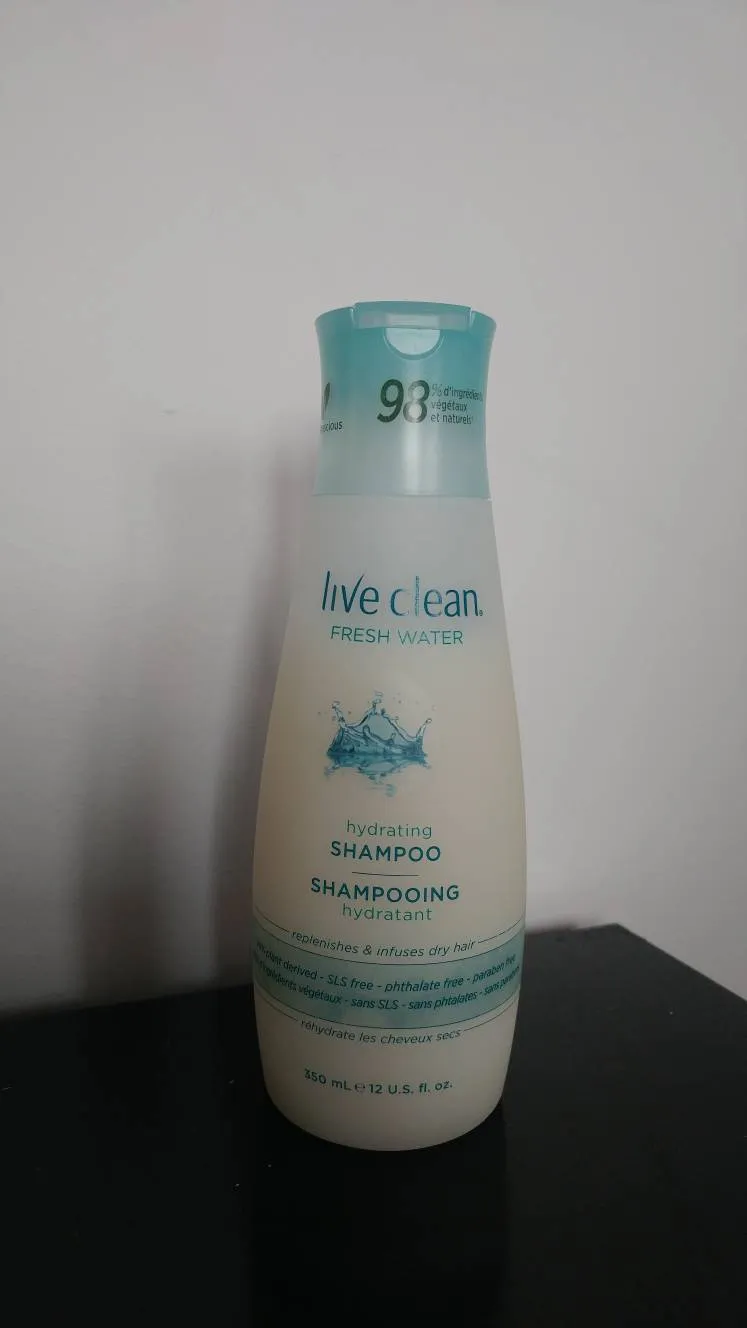 Opened, 3/4 full Live Clean hydrating shampoo for dry hair, "fresh water" fragrance.