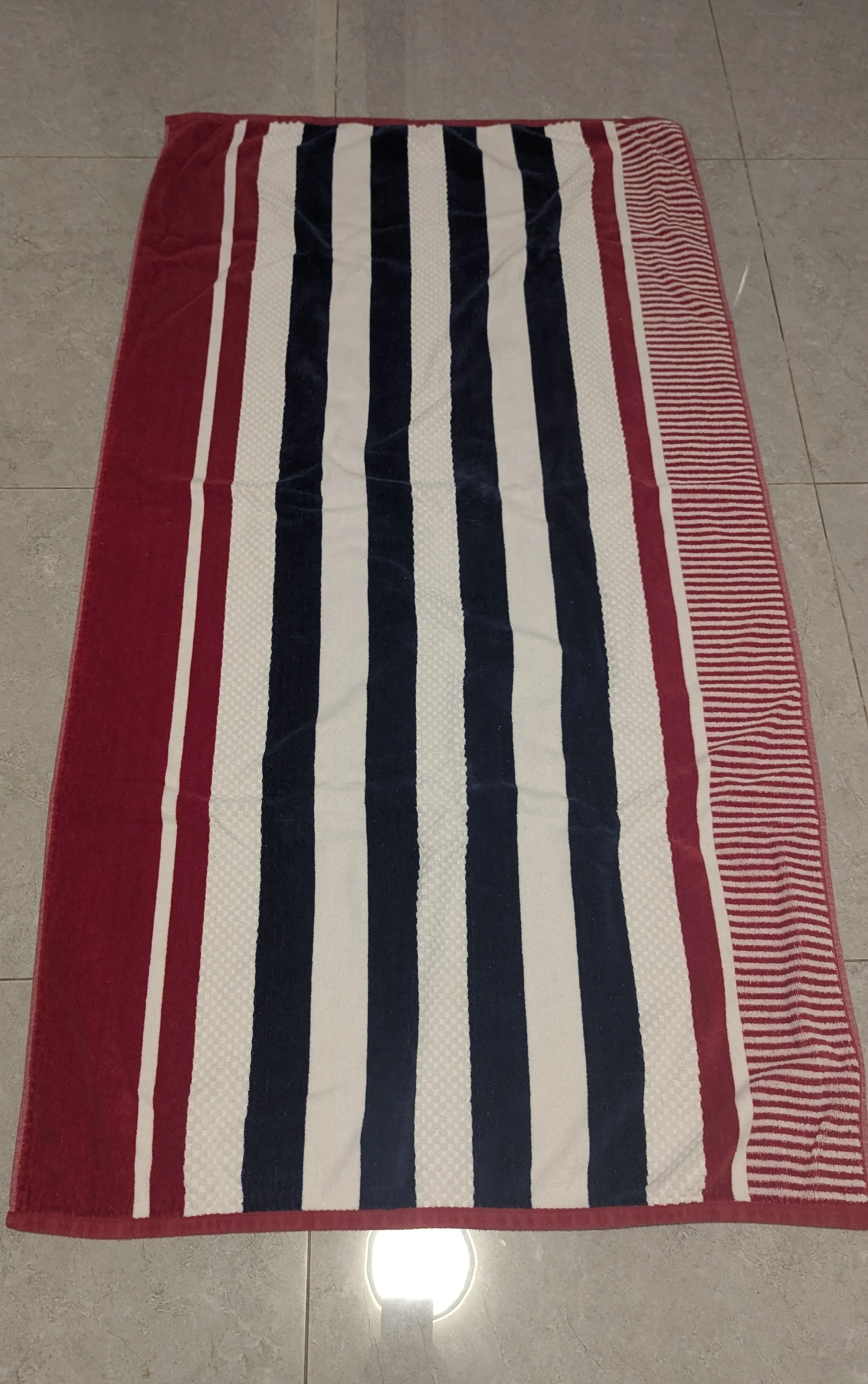 Striped beach towel. Red, white, and navy colours. 100% cotton. Machine wash warm, tumble dry low. Made in India.