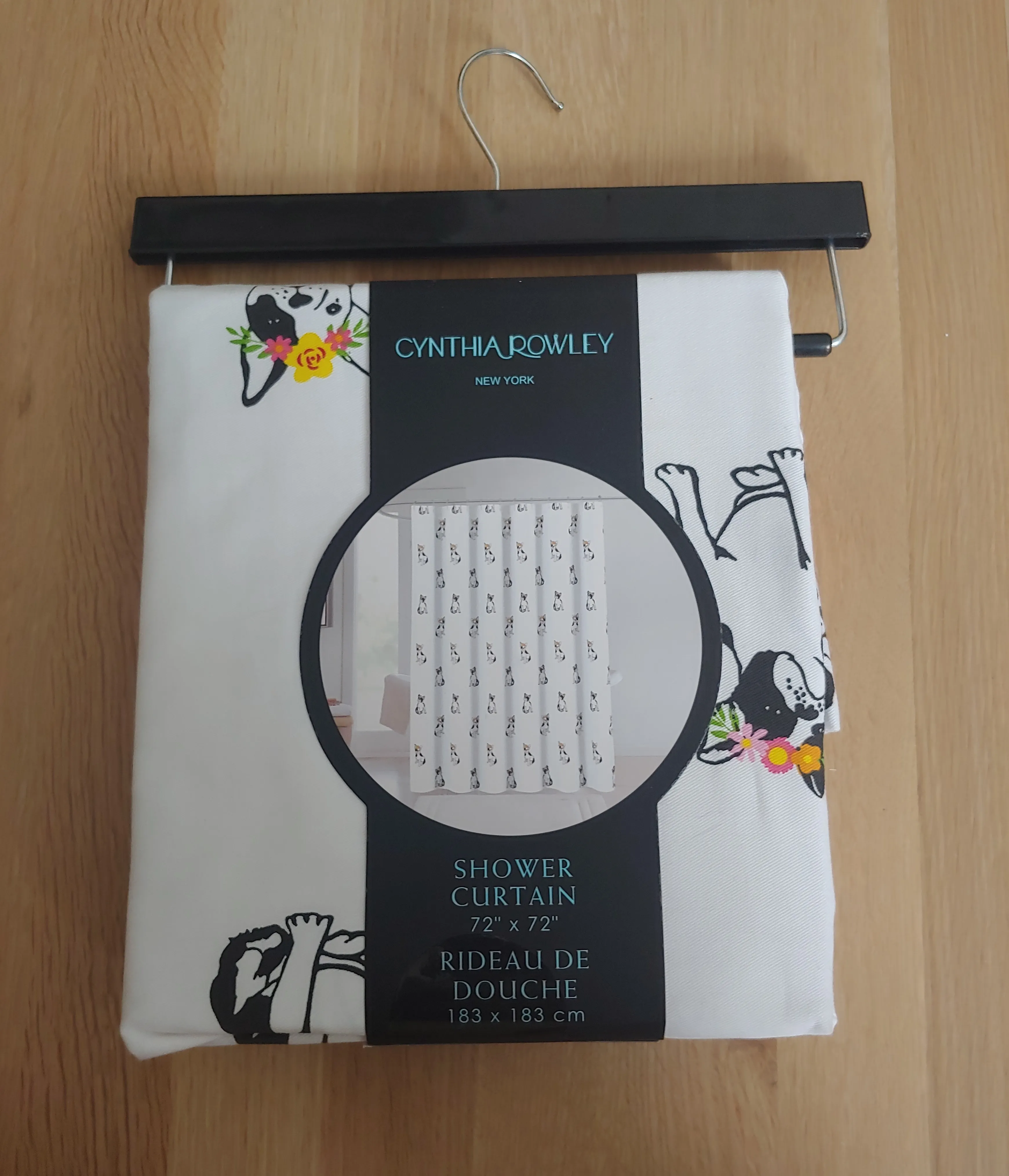 New shower curtain. 72" x 72". Features a cute French Bulldog design. White background. Cotton and polyester.