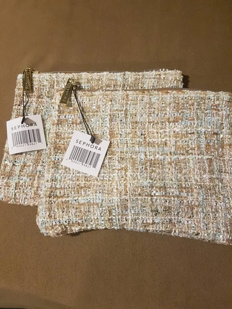 Received these recently at a Sephora Rouge event. Both are pastel colored woven knit bags with metallic thread and sequin detailing and shiny gold zippers. Each bag is valued about $10. Willing to trade each individually. Check my ISO's and make me an offer, I also accept BTZ and love bundle trades 😊.