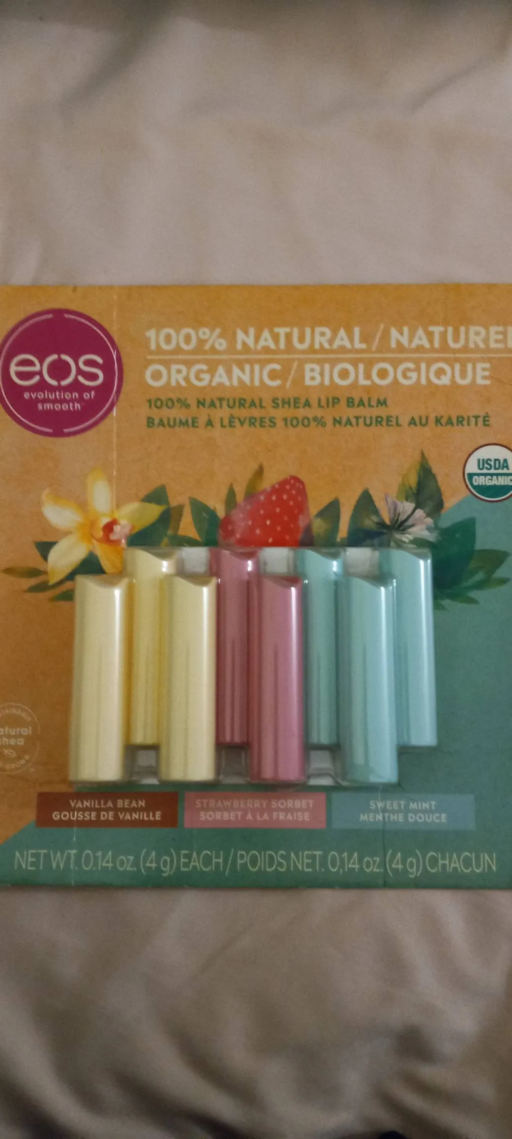 eos 8 100% NATURAL ORGANIC 100% NATURAL SHEA LIP BALM 3 VANILLA BEAN 2 STRAWBERRY SORBET 3 SWEET MINT ISO PLEASE OR 6 PK. DIET PEPSI 710 ML AND ZESTY CHEESE DORITOS WILL NOT REPLY TO " ANYTHING OF MINE "