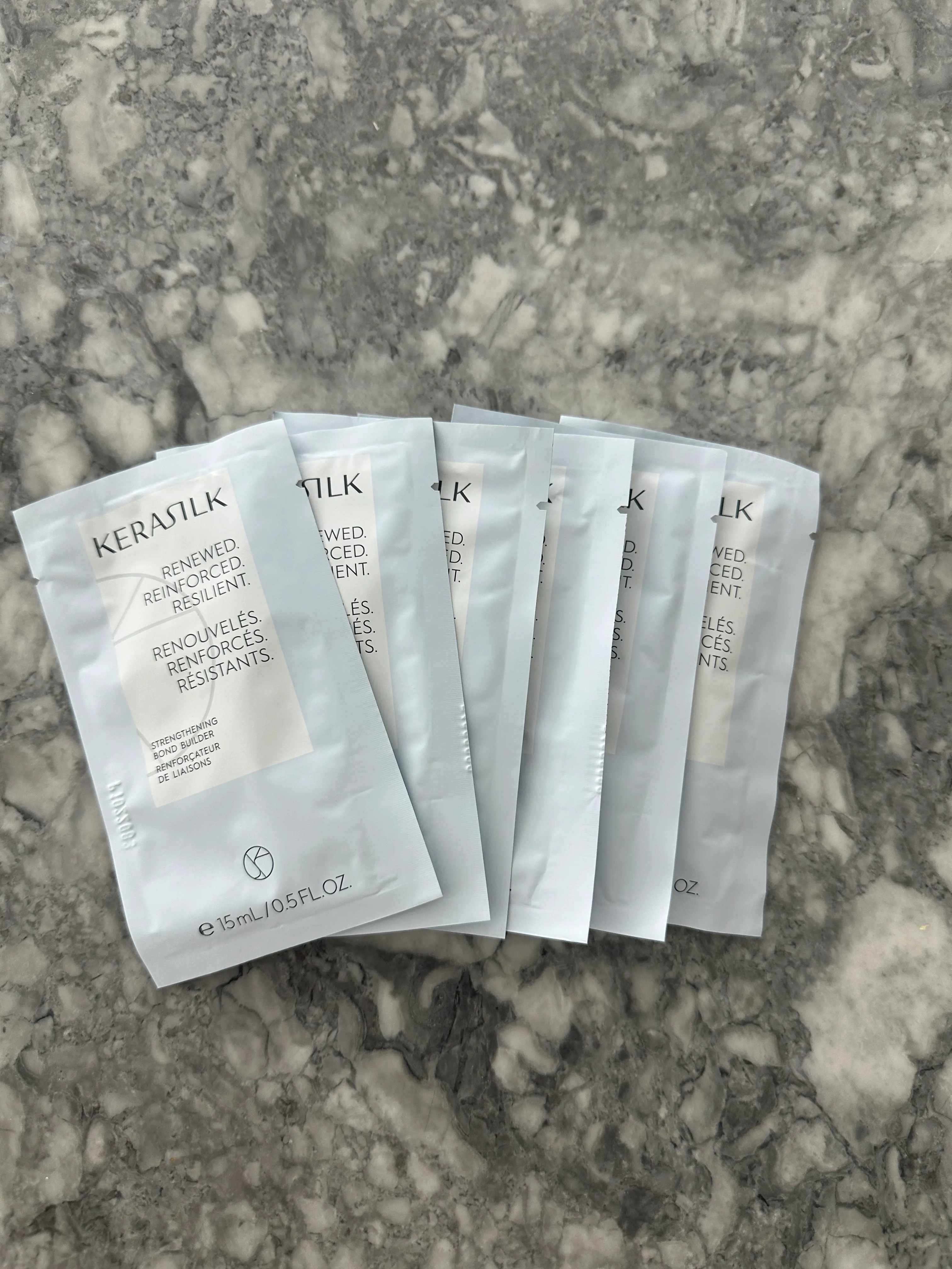 Six 15ml pouches are equal to 1 full bottle which is sold for $38 plus tax, Kerasilk bond builder leave on serum. Light weight, non greasy, this product will help your hair stay healthy and strong. I use it but I have many full size bottles already and tons of samples which I want to get rid of.