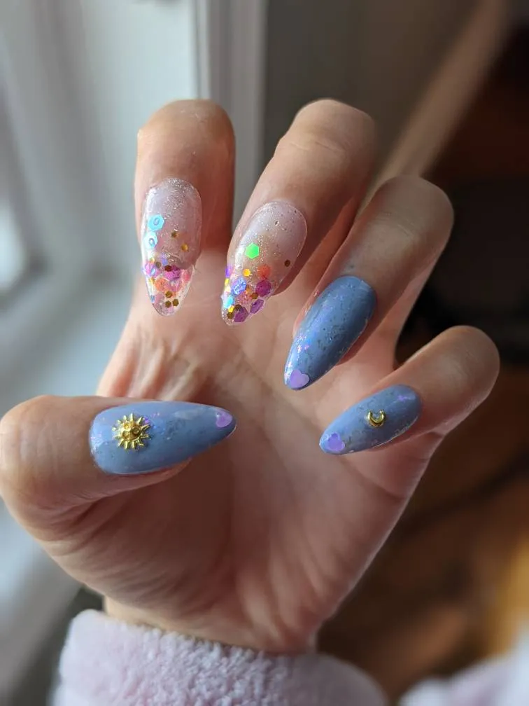 This beautiful muted pastel set has just the right amount of twinkle to make it look like magic. This periwinkle set is inspired by those late night turned to early morning talks, represented by the elegant gold charms on the thumb and pinky. The hearts and the multicoloured confetti adds a bit of romance to this design. Have you ever talked to someone all night? Wear this set to celebrate Valentine's Day or just any day for a celestial and elegant addition to your style.