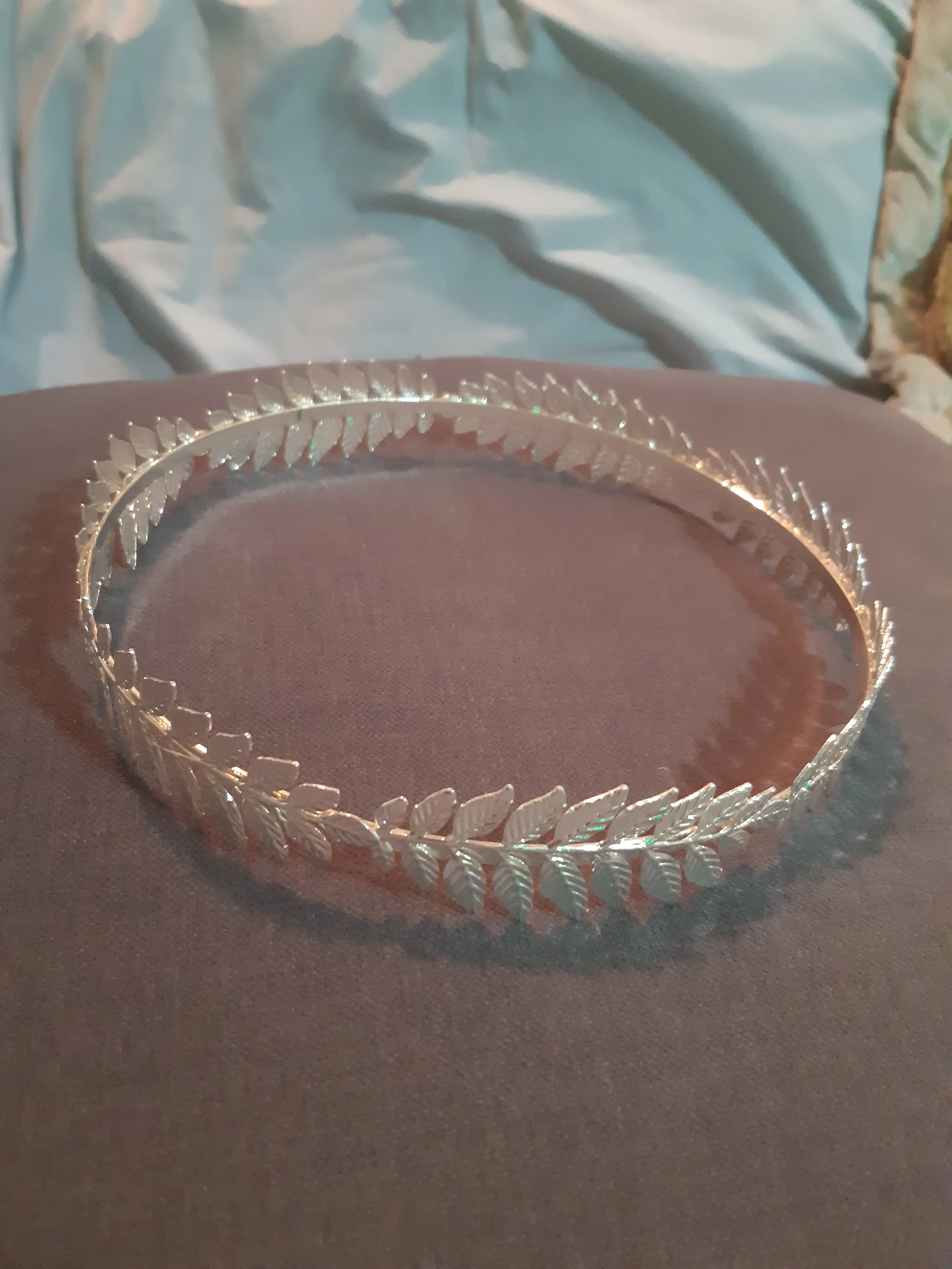 Silver-coloured crown. Unsure of the specific metal. Fits a bit big. No tarnishing, only used once.