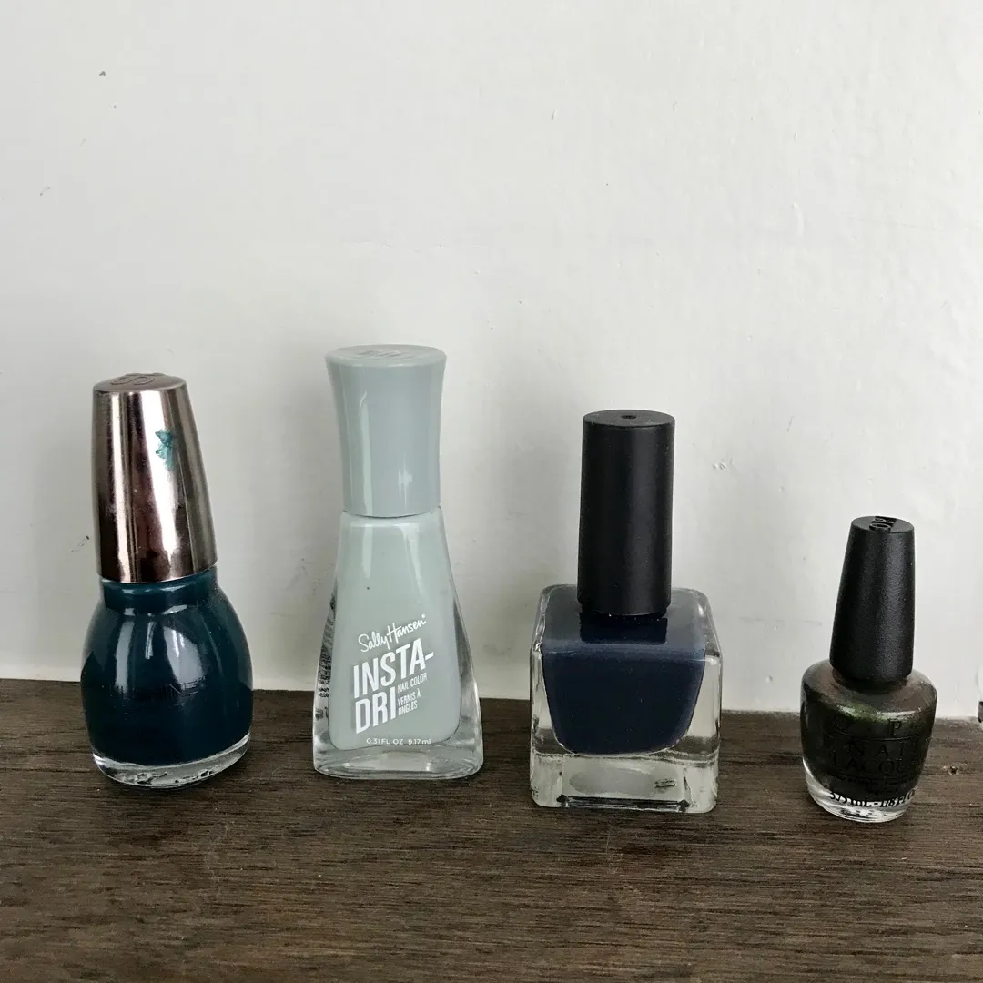 The colors are hard to capture in photo but 1- a deep dark teal with a gel shine finish (Sinful Shine brand) 2- sally Hansen insta-dry in a pale minty blue 3- UO brand, dark slate blue-gray 4- OPI mini (so cute!) with a cool duo chrome effect, metallic green shifts to metallic brown