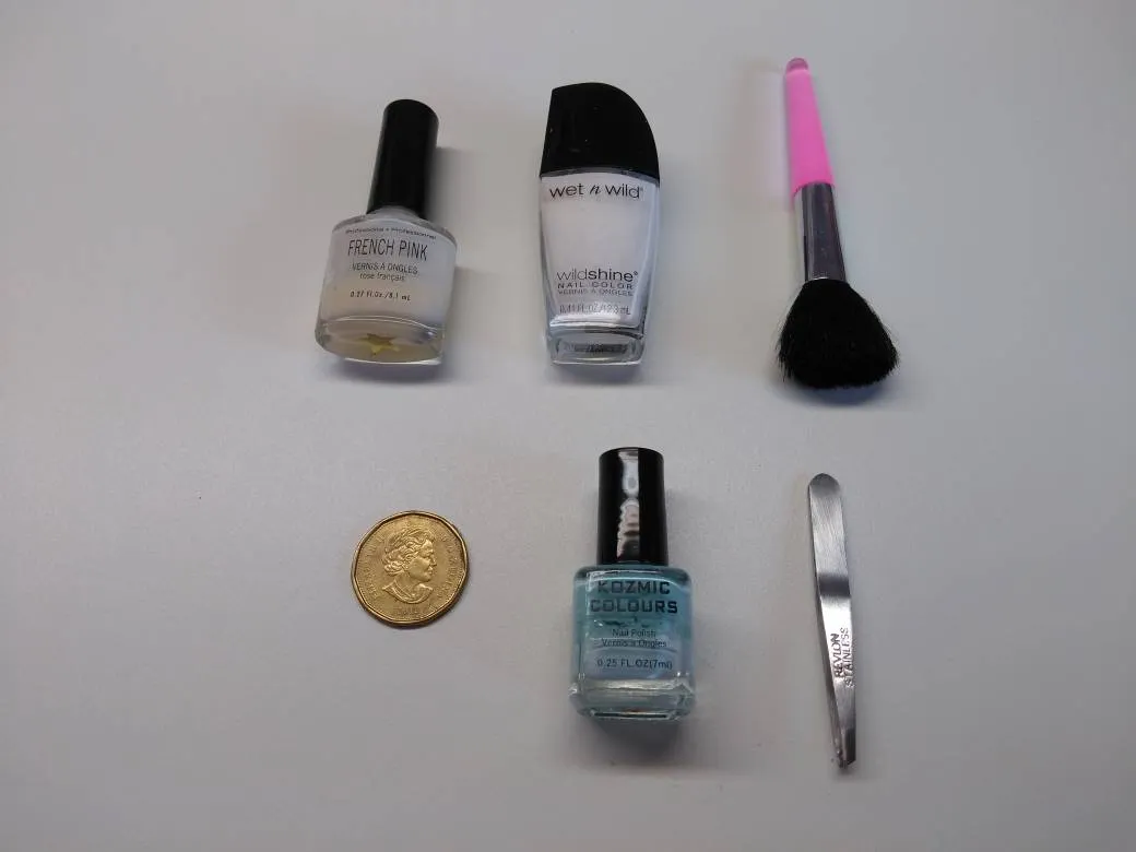 🆓 with trade: dry/thick nail polishes, cosmetic brush, stainless steel tweezers. Loonie for scale. Traded: tweezers