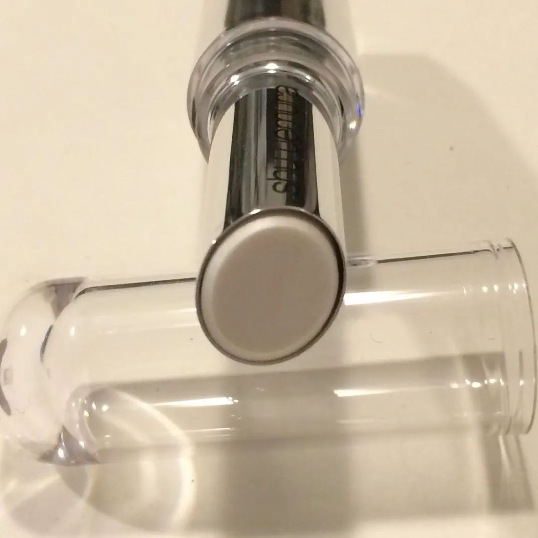 Brand new, in box. Can be used as a base and on its own looks whiteish and shimmery (pic #4, screenshot from a blog).