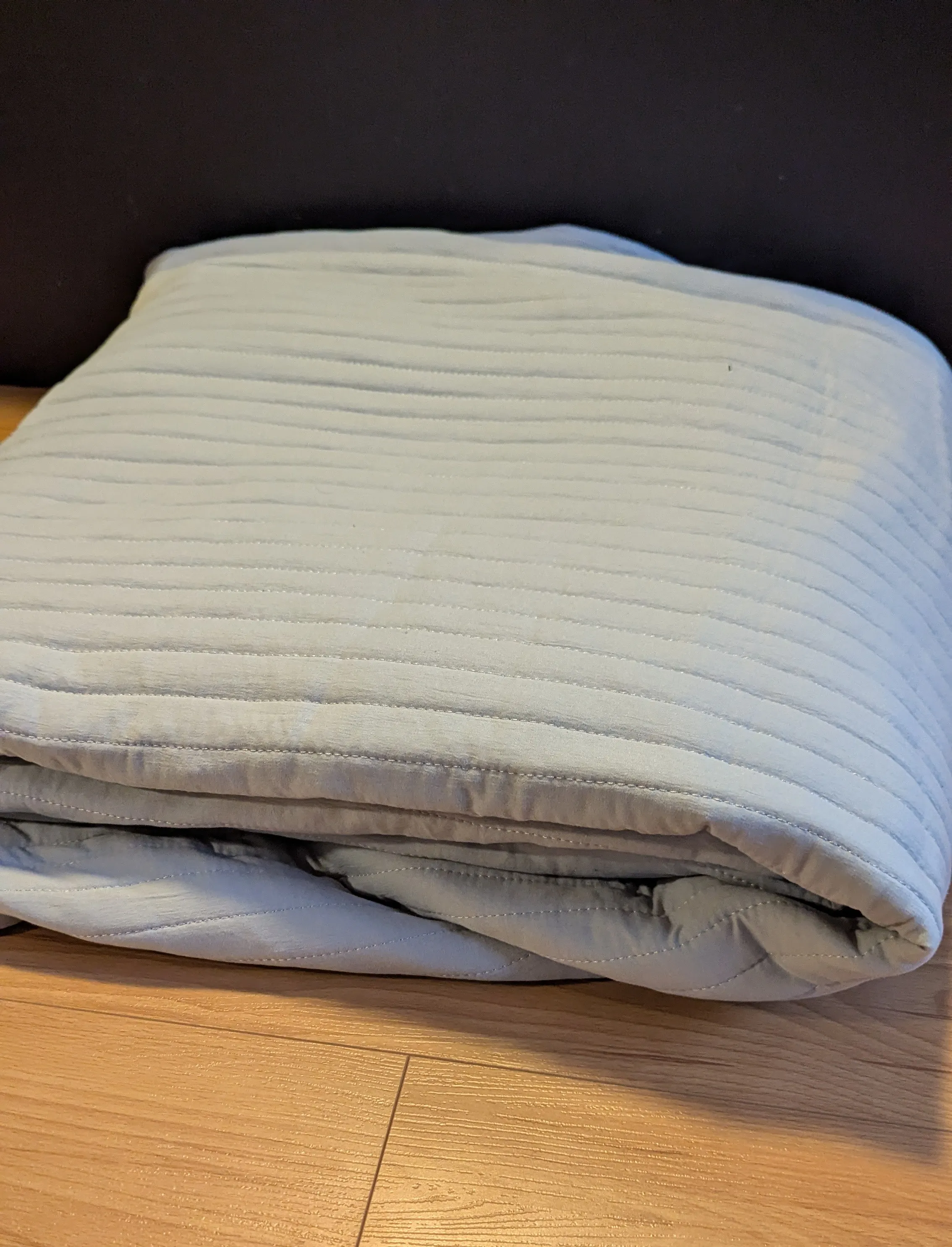 Lightly used, 100% polyester throw blanket. Features a grey colour and vertical channel quilting. Machine washable. Perfect for adding a touch of comfort to your living space.