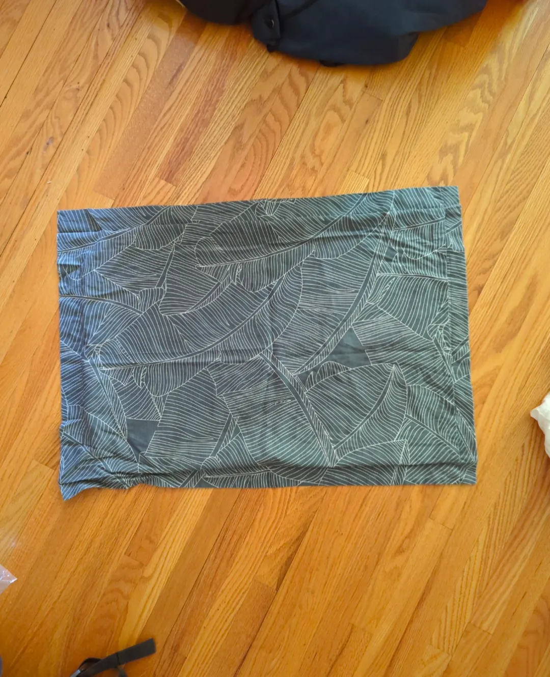 Gray pillowcase with a white leaf pattern. Soft material.