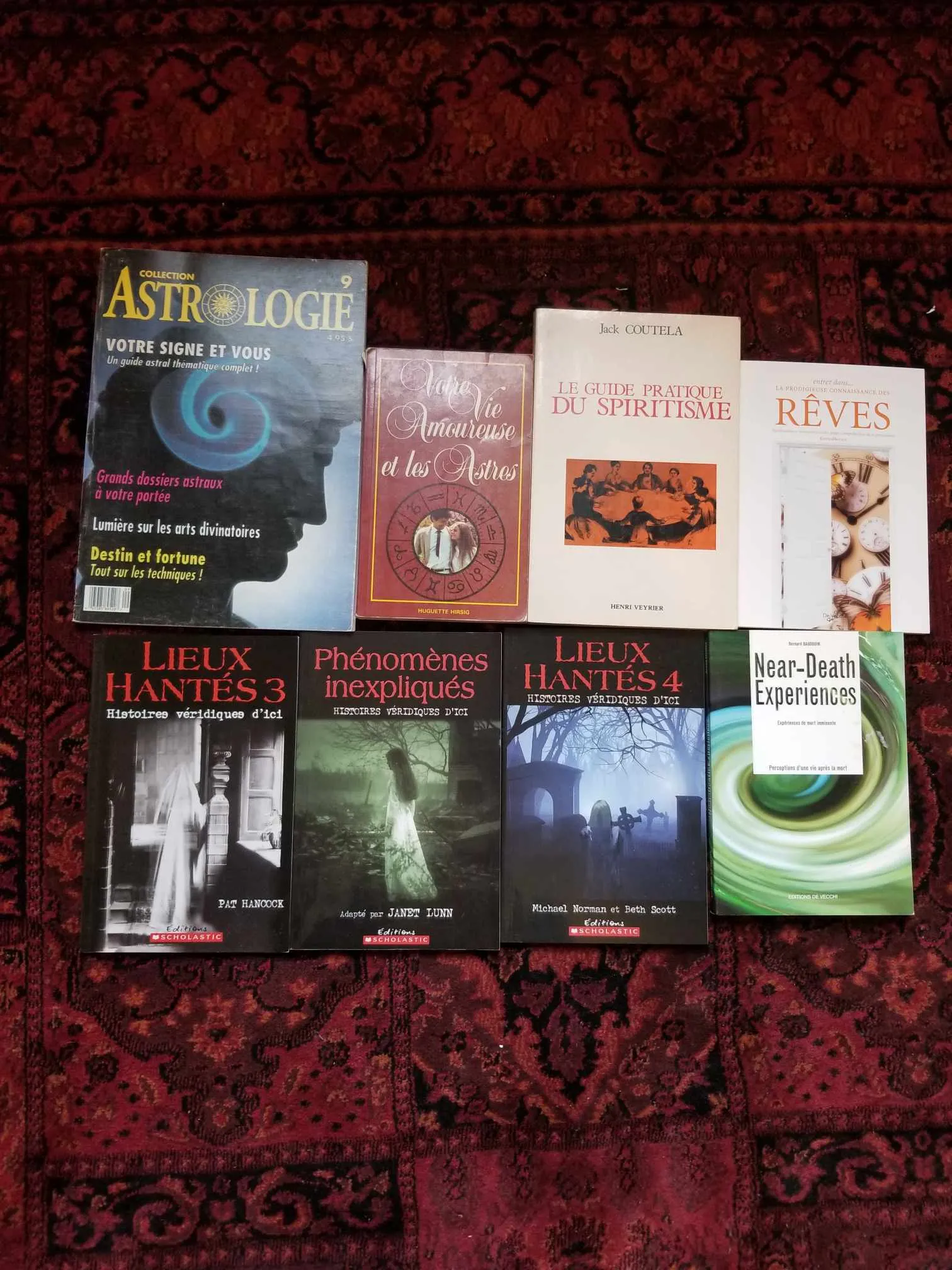 Magasine "Astrologie" Huguette Hirsig - Votre vie amoureuse et les astres Jack Coutela - Le guide pratique du spiritualisme Karmadharaya - La Prodigieuse connaissance des rêves Pat Hancock - Lieux hantés 3 Janet Lunn - Phénomènes inexpliqués Michael Normand et Beth Scott - Lieux hantés 4 Bernard Baudouin - Near-Death Experiences
