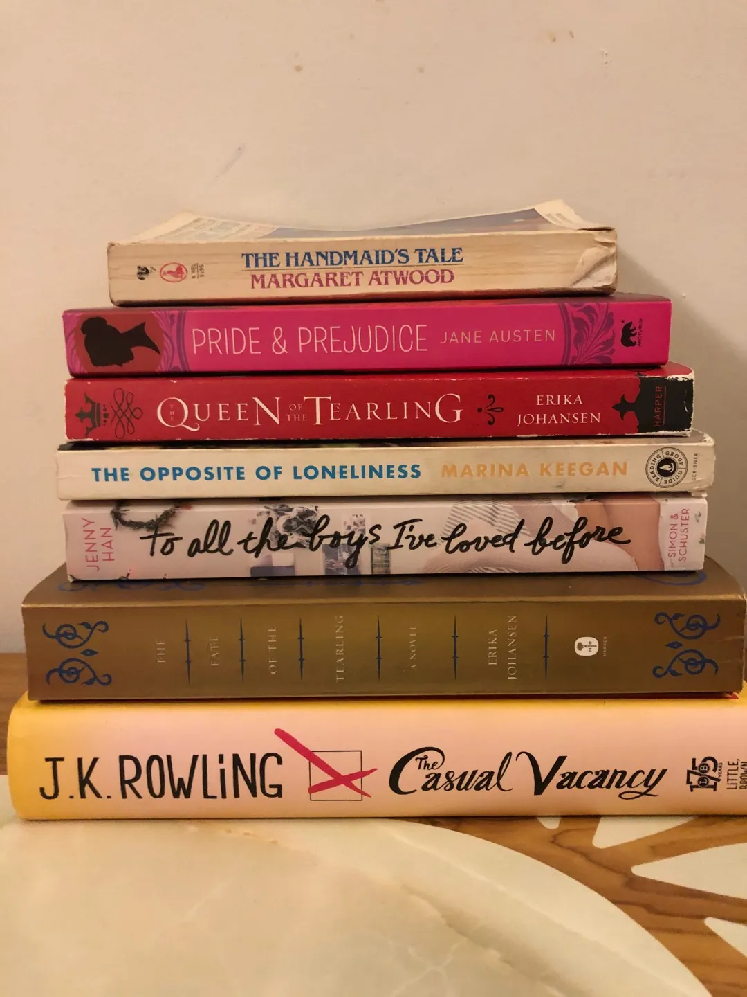 The Handmaiden's Tale- Margaret Atwood- TRADED Pride and Prejudice - Jane Austen- TRADED Queen of The Tearling- Erika Johansen The Opposite of Loneliness - Marina Keegan To All The Boys I've Loved Before- Jenny Han- TRADED The Fate of the Tearling- Erika Johansen The Casual Vacancy- J. K. Rowling- TRADED