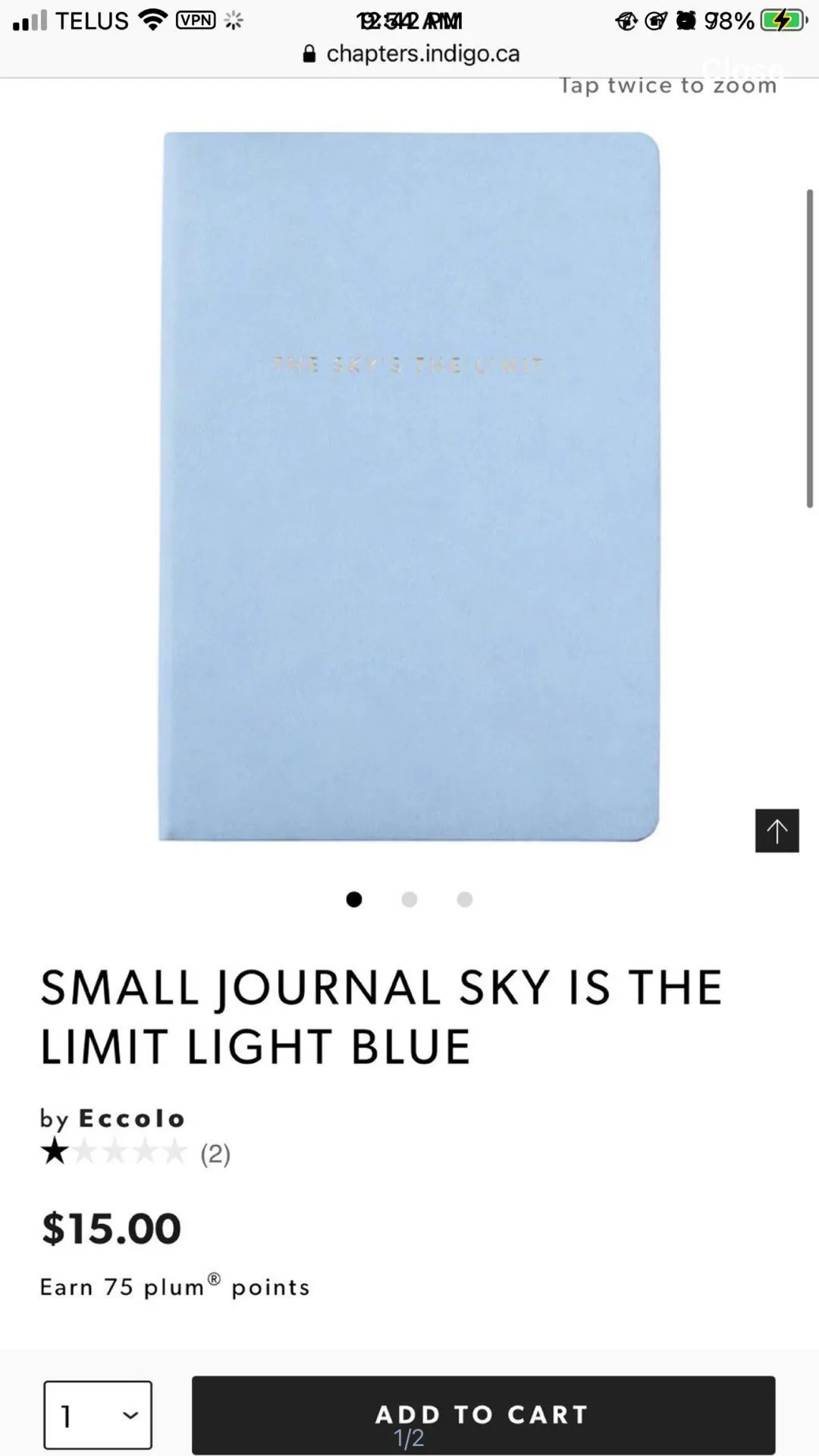 Light blue leathery cover with gold lettering (THE SKY IS THE LIMIT). Pages inside are lined.