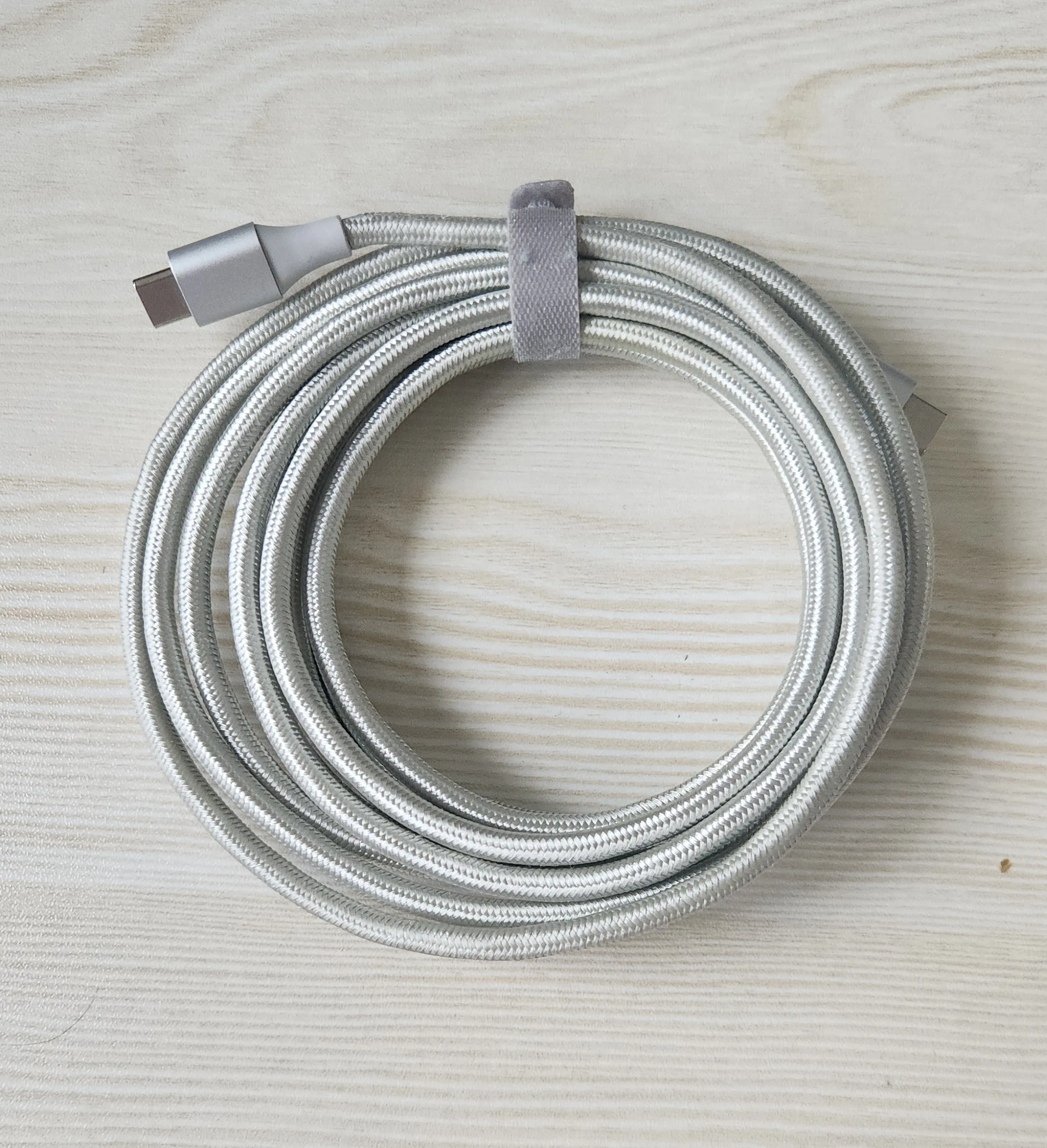 A silver braided USB-C to USB-C cable that is 10 feet I. Length.