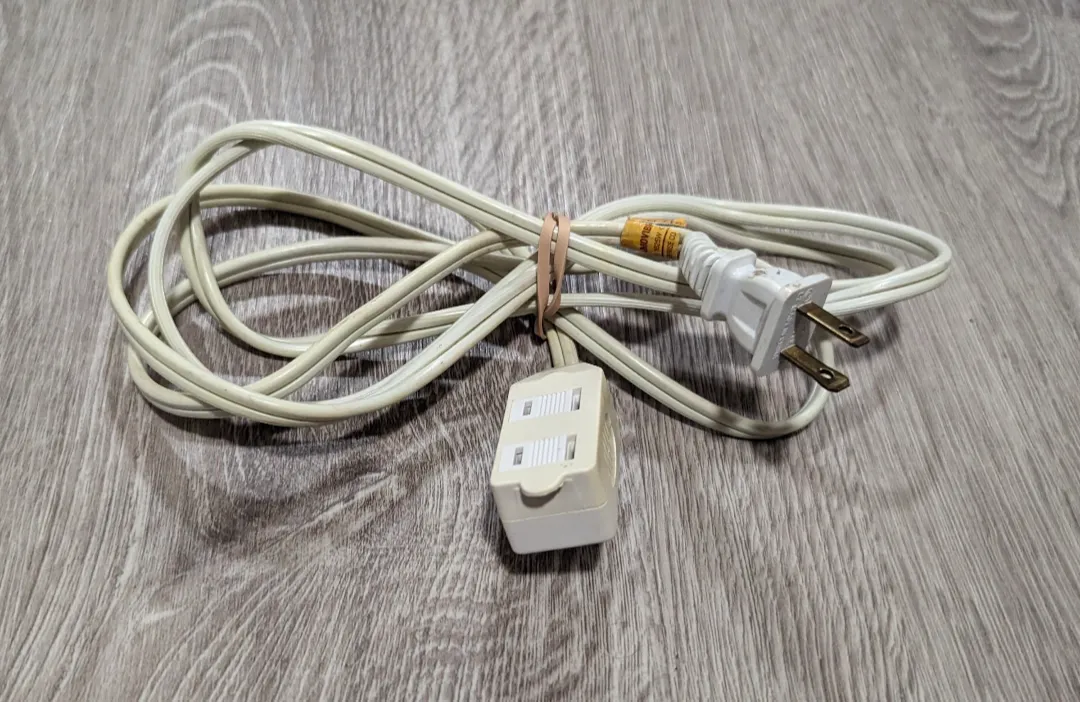 White extension cord. Attached is a power strip with multiple outlets. The cord is secured by a rubber band. You can use this to easily add some extra outlets to your home.