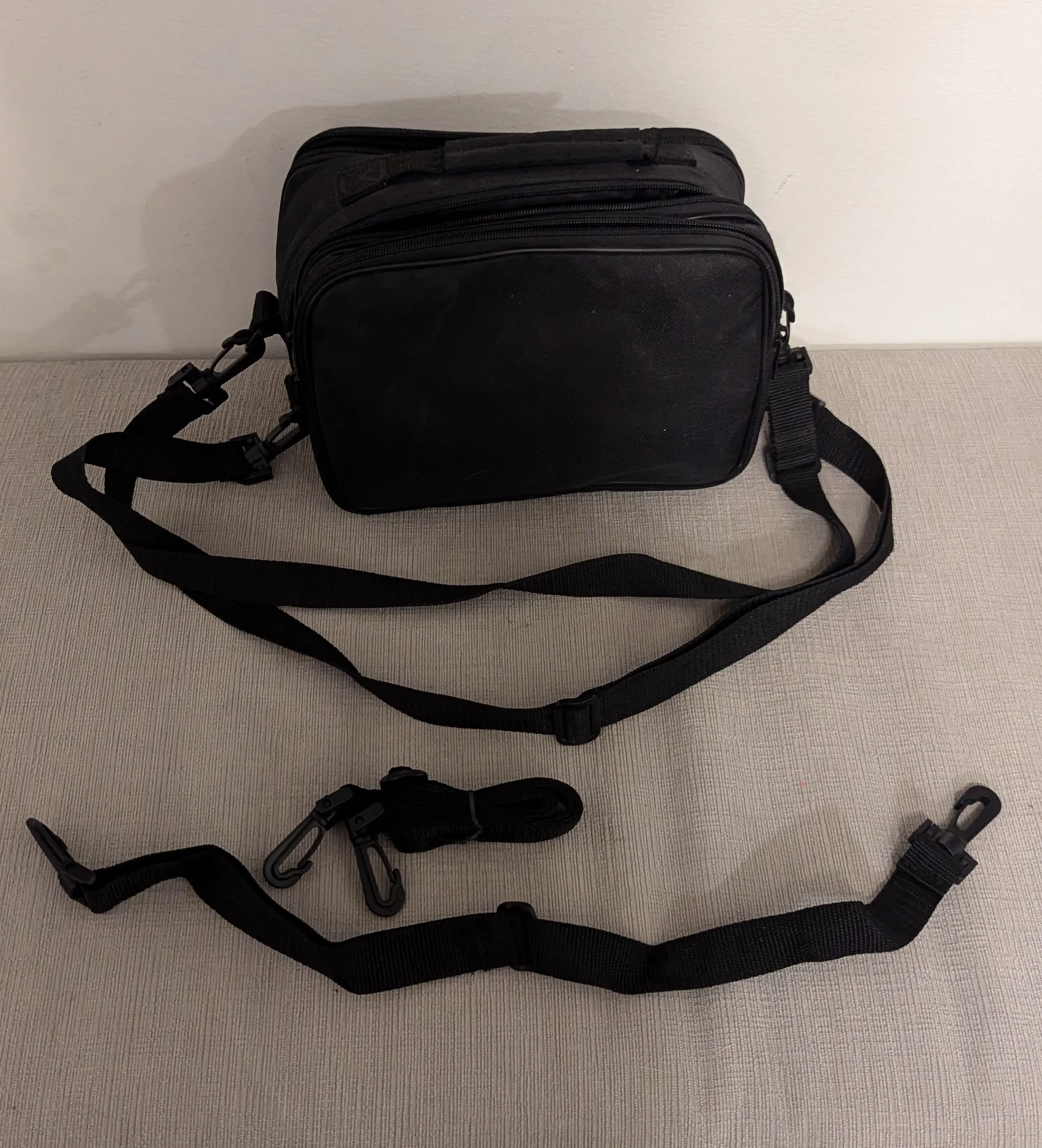 Black camera bag with adjustable shoulder strap. Includes two extra straps with clips. Two main compartments with zippers.