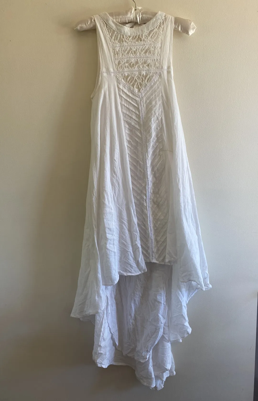 A very majestic 100% cotton dress! Mullet style, has a built in lining layer and lace detailing. There was a small rip that has been sewn shut (shown in picture). It is missing one closure button (also shown) at the back of the collar but it doesn’t affect the function of the dress/closure at all. -size: is US 2/ Australian 6. I’m a pretty standard size small and it fit me perfectly.