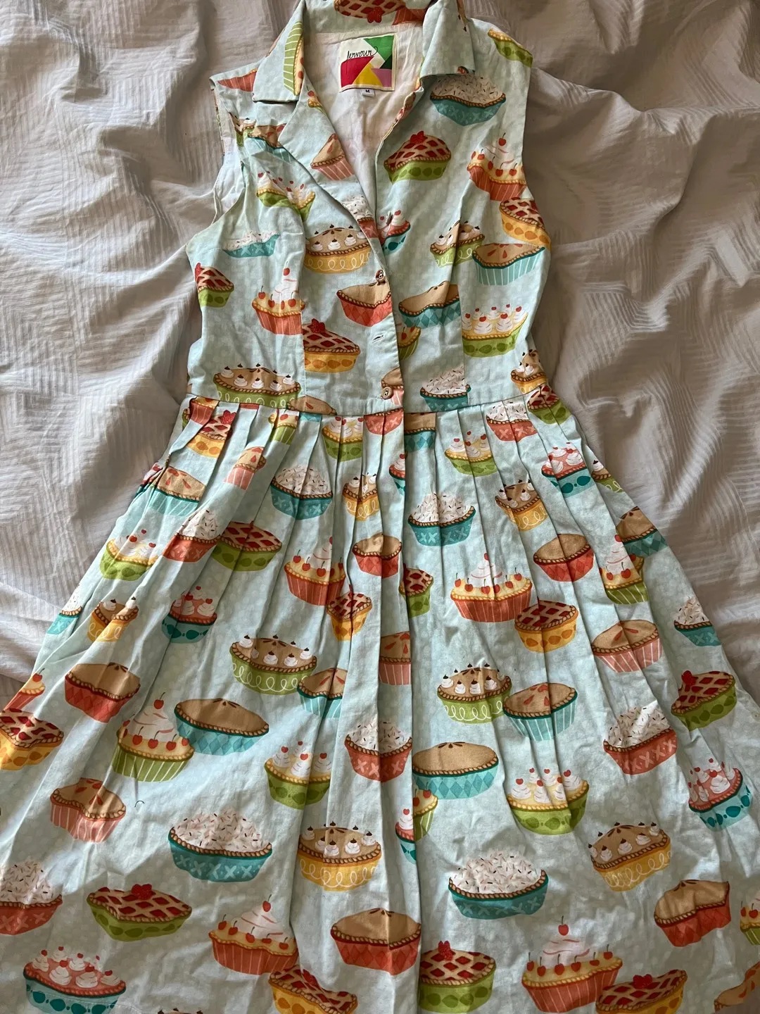 Loved this gal! Great vibrant print and 50s shape. Size medium. A bit of a freyed part around one button but unnoticeable! As pictured. There’s also a rip at the bottom of dress that I’ve pinned but a quick sew should help if you have that ability. Also pictured :)