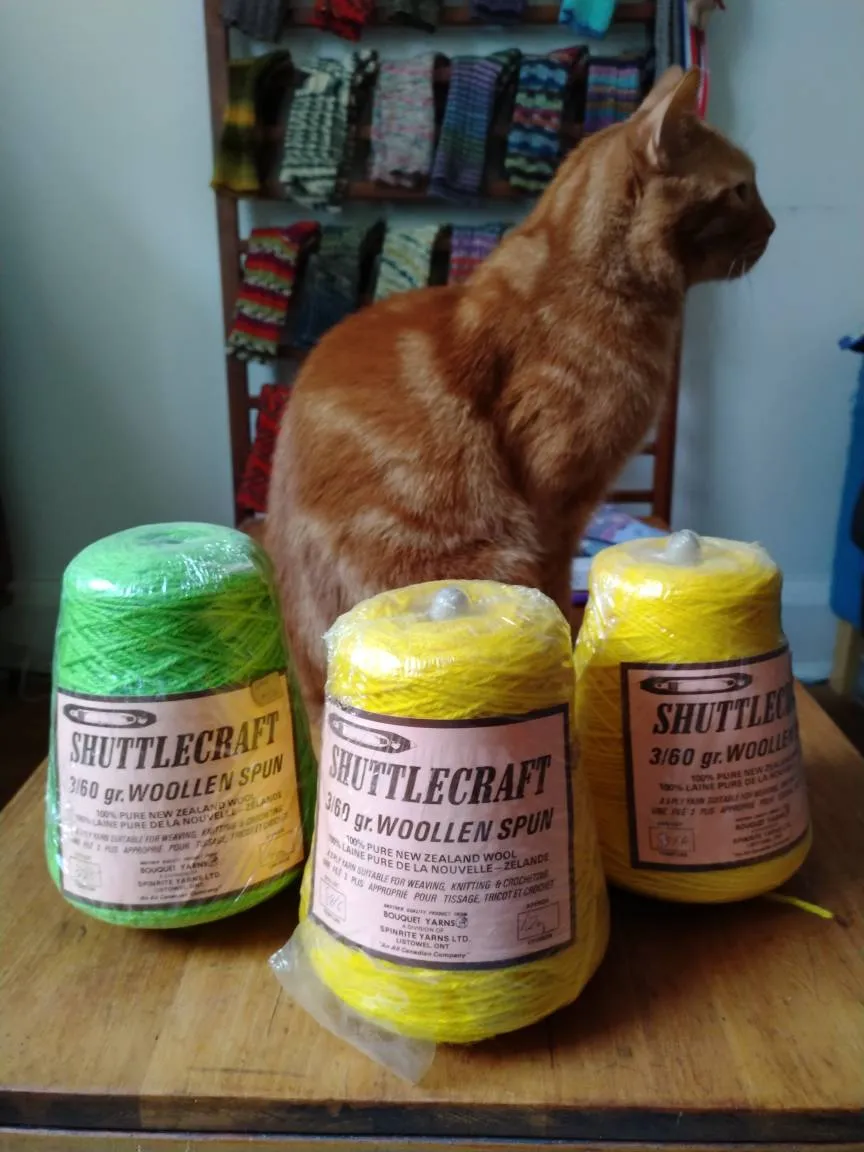 Never opened, so cones are full. Quite coarse/scratchy because 100% wool, 2 yellow and 1 green. Willing to trade colours separately.