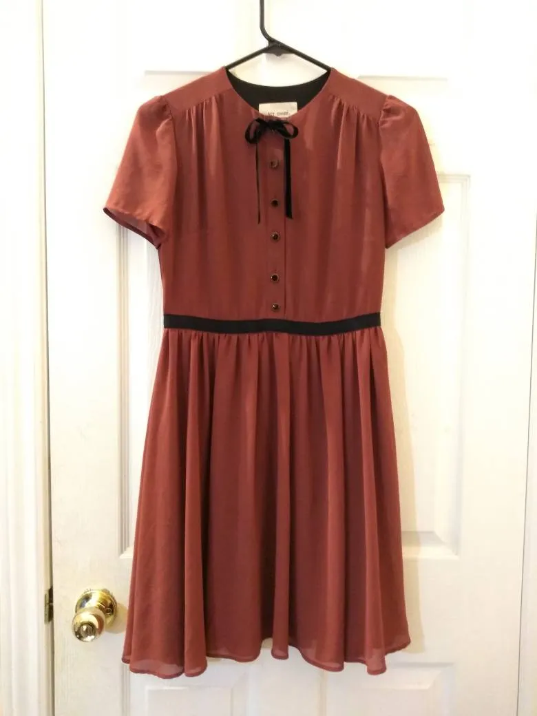 Made in Canada. Lovely pleated dress with black accents. Some buttons in front need to be resewn. Sad rebunz, too tight for my shoulders.
