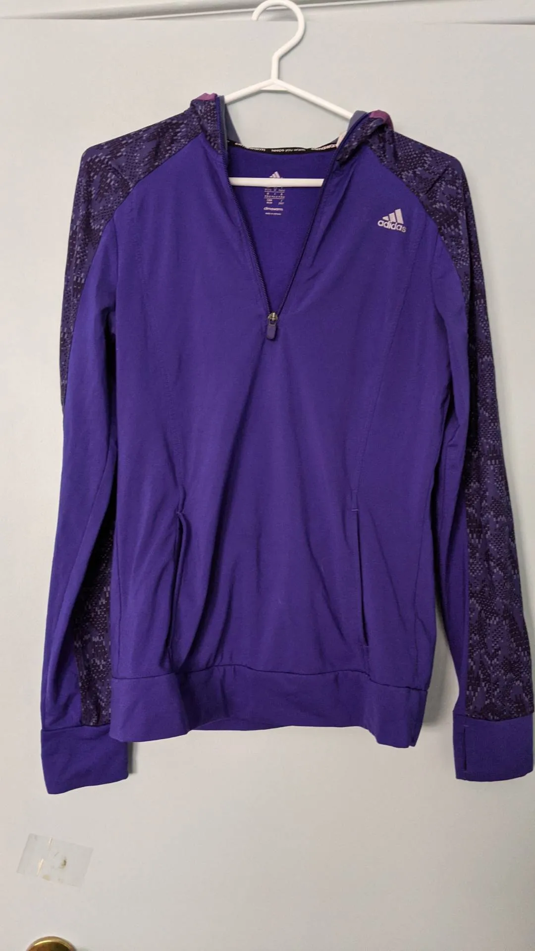 Medium. Excellent condition, deep purple colour, and flattering fit. Hood, pocket and thumbhole.
