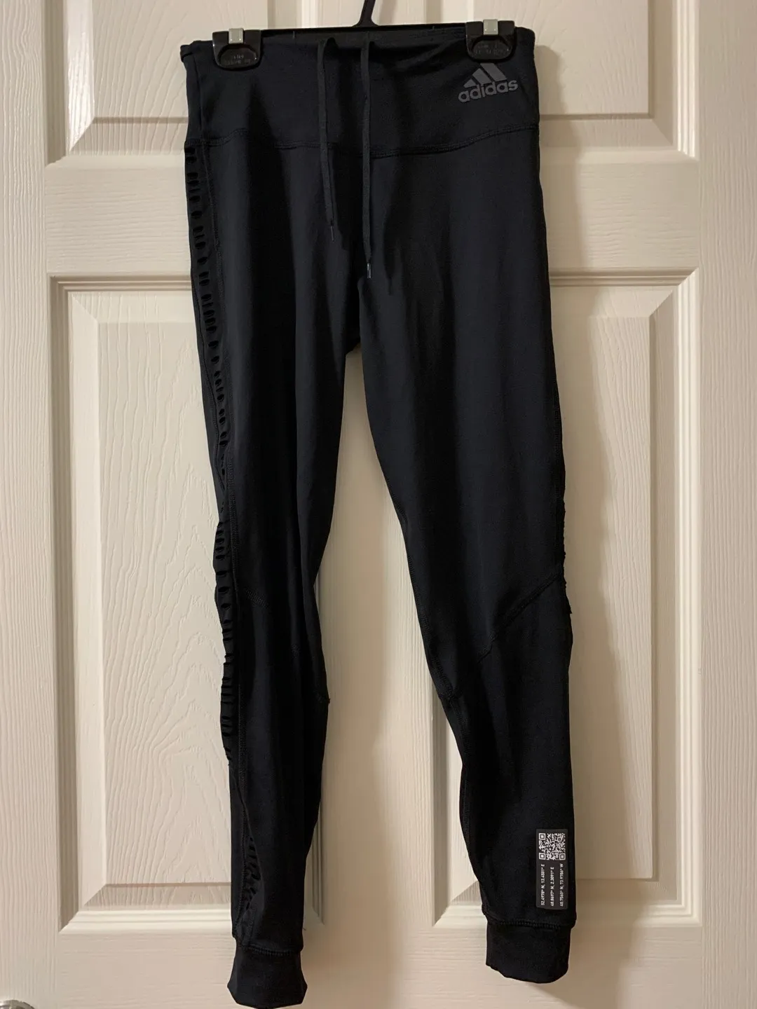 Has drawstring inside waist and zip pocket on back Never ended up wearing as I didn’t realize when I ordered them that there was a cut out design along the sides of the legs (not my fav). 85% recycled polyester, 15% spandex