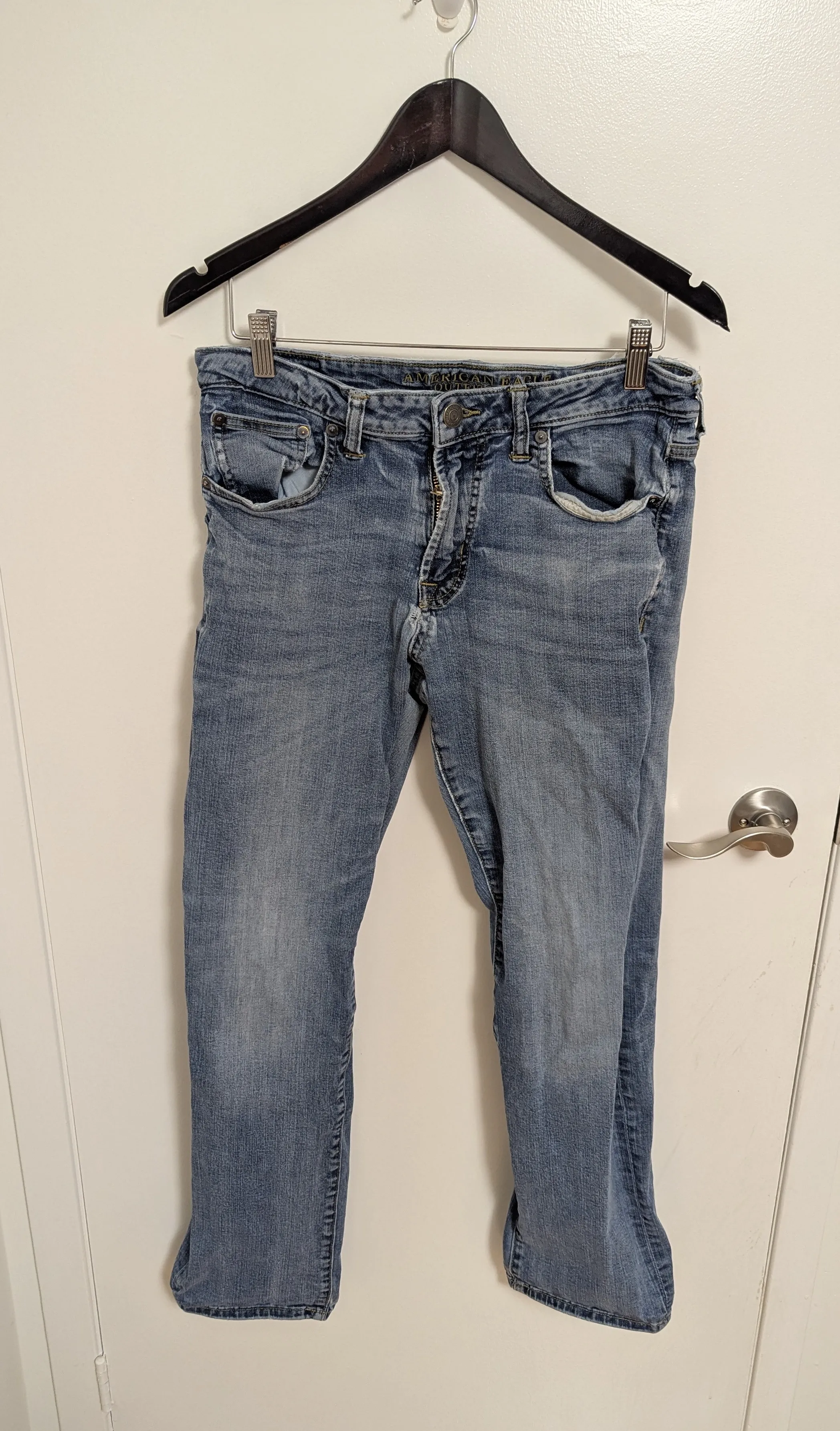 Men's American Eagle Extreme Flex jeans. Size 32x32. Light wash denim. Some wear and tear. Small hole near the pocket.