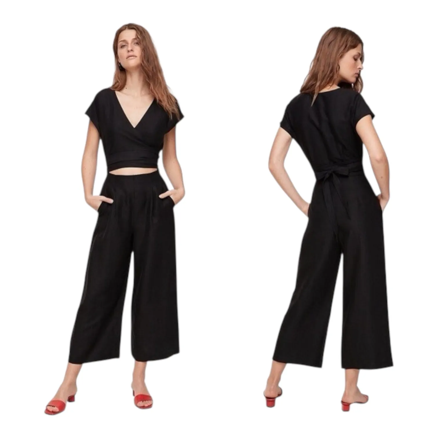 Aritzia Wilfred Black Brax Linen Blend Wrap Jumpsuit Size 6 Bow Wide Leg Cut Out Great worn condition The Brax is made with a soft linen blend that's light and airy great for rising temperatures. The wrapped bodice defines your waist, while the cut-out detail gives the illusion of a two-piece design. Zip closure. Cropped wide leg. Short Sleeves. Tie front, cut out detail. V neck. Fit: Classic follows your contours with a little room. Content: 63% lyocell, 37% linen. Trim: 100% cotton.